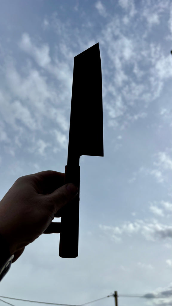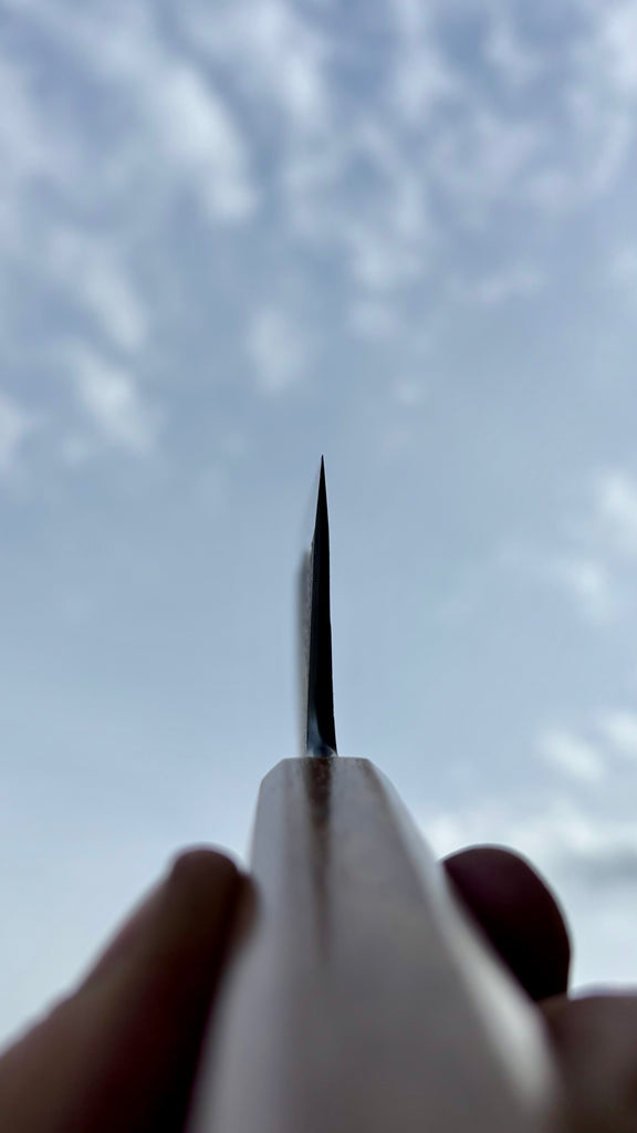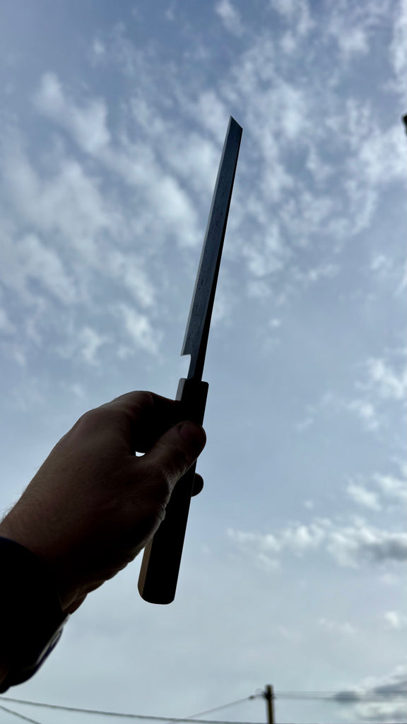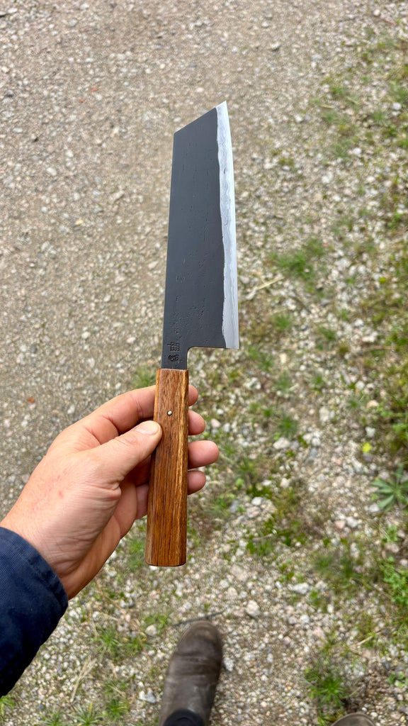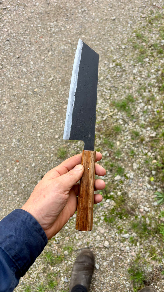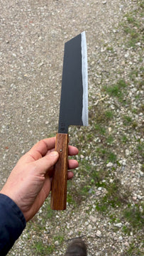 This Tetsu Bunka feature a medium size blade, good distal taper, thin tip. Flat profile at the heel with a slight curve toward the tip. The San-mai is laminated by myself in house. Forged to shape and to geometry the blade is ground on water cooled grinding wheel.