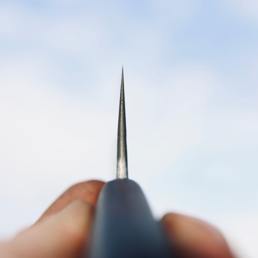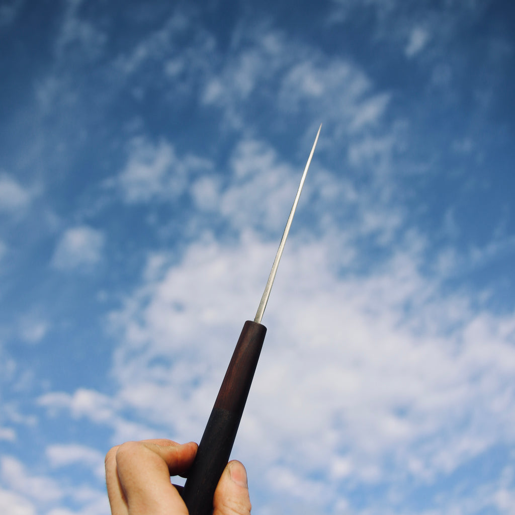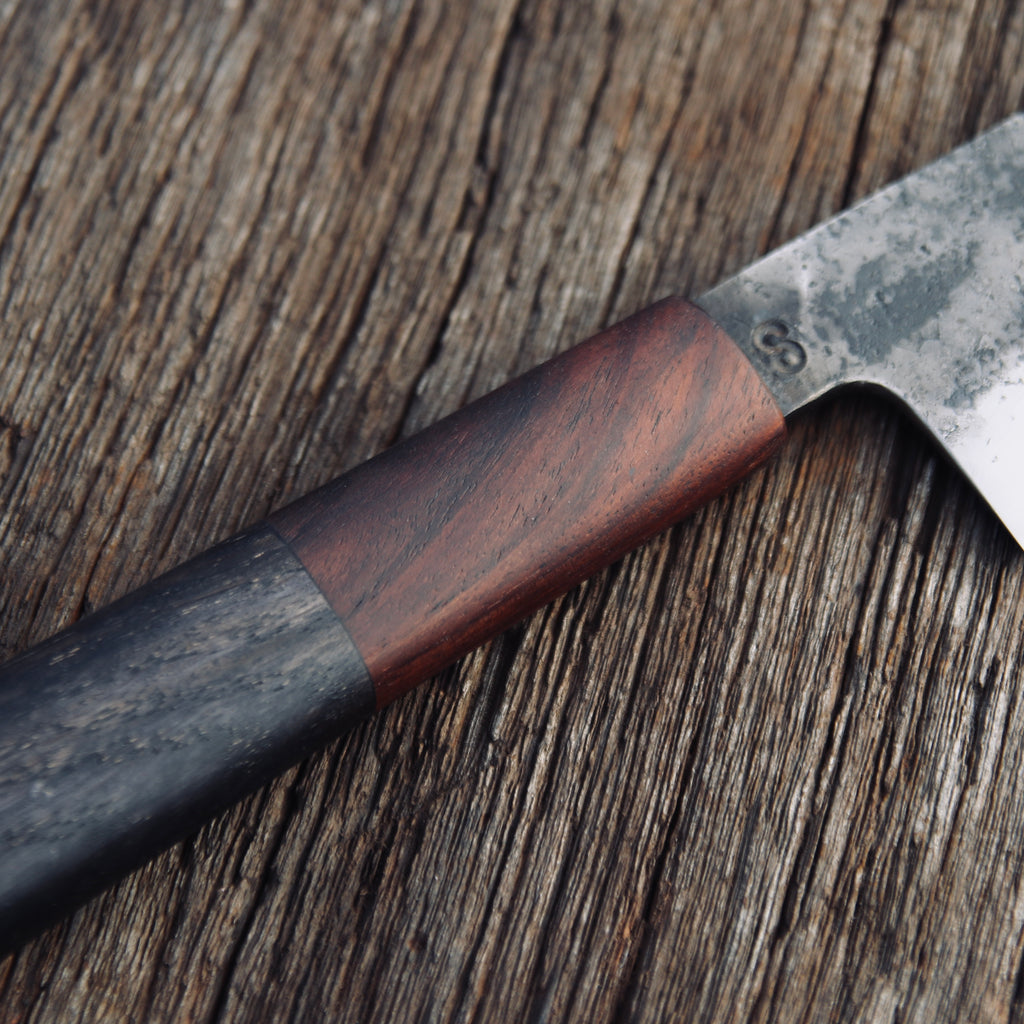 This is a workhorse Santoku. Thick spine the blade taper to a very thin tip. The geometry should bring speed when cutting but with a good penetration. The bird beak 2 tones handle complement the blade very well.