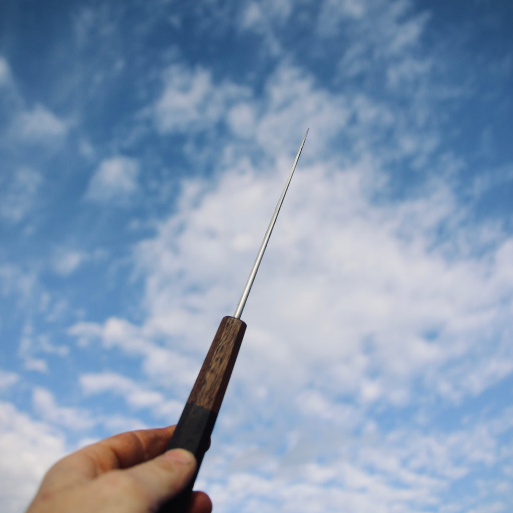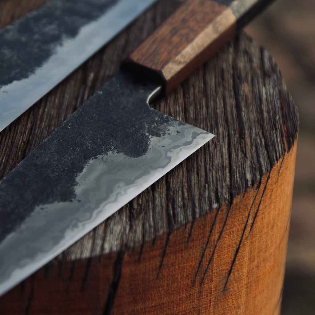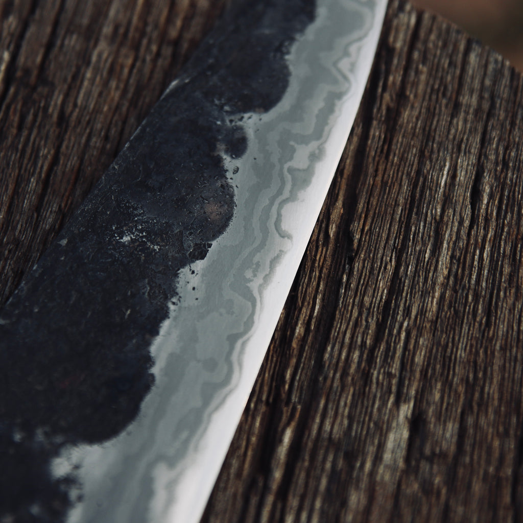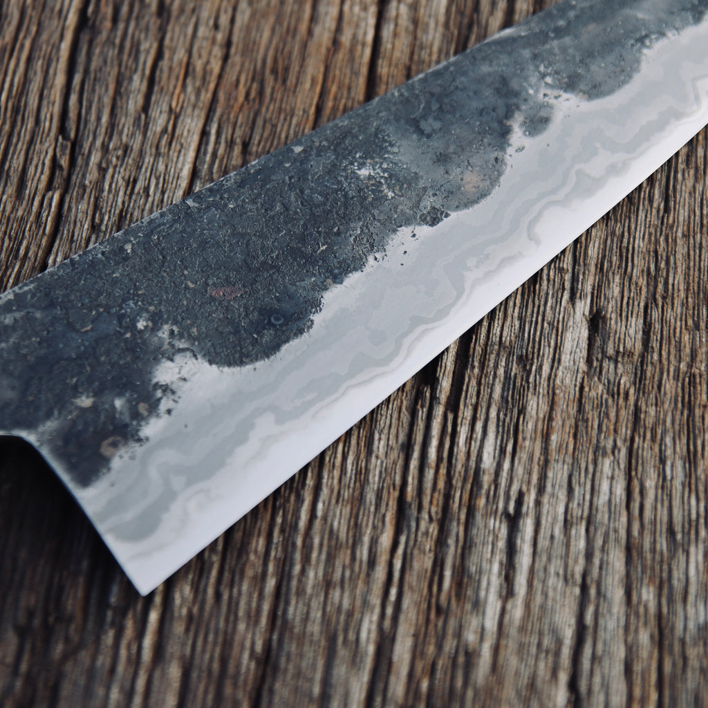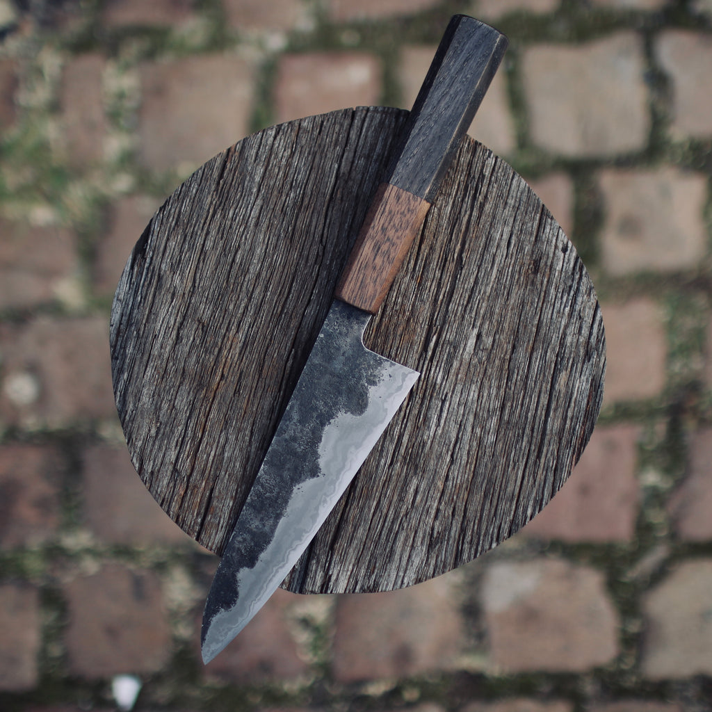If you need one knife in your kitchen, this is the right size (I know everyone probably have a different opinion on that). The Pure iron and soft steel pattern welded cladding give a lot of personality and the 26c3 core a very good edge.