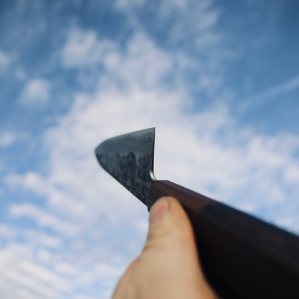 Santoku 170x50mm, San-maï hand forged from 26c3 (Spicy white) high carbon steel core and pattern welded steel and iron clad in Sheffield.