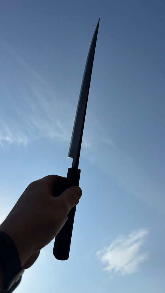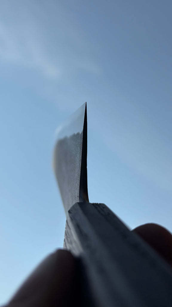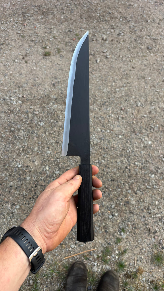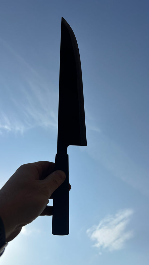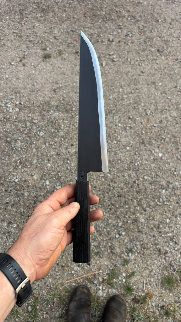 This Tetsu French Chef feature a long blade, good distal taper, thin tip. Flat profile at the heel with a strong curve toward the tip. The San-mai is made from 135Cr3 steel core with vintage soft iron cladding. Forged to shape and to geometry the blade is ground on water cooled grinding wheel.