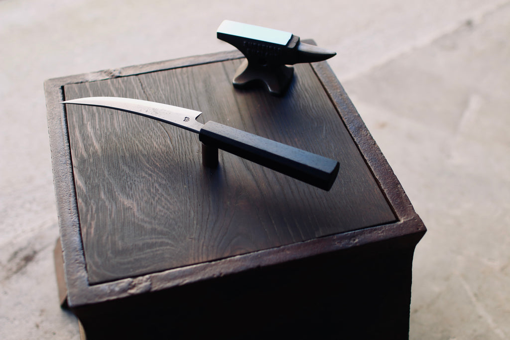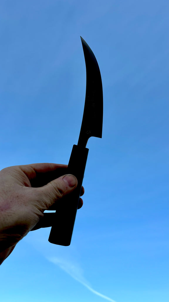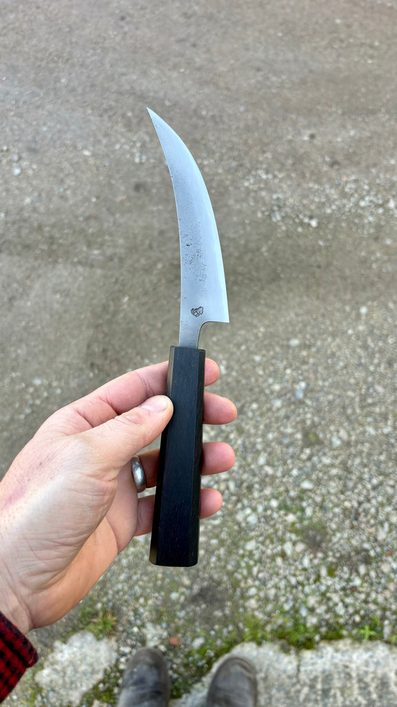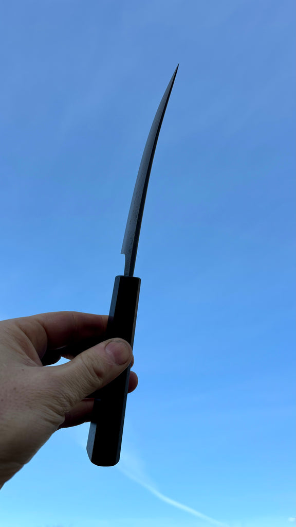 This Nishiji Gokujo feature a short curved blade, good distal taper, and thin tip. The San-mai is made from 135Cr3 steel core with soft steel cladding. Forged to shape and to geometry the blade is ground on water cooled grinding wheel with a satin finish.