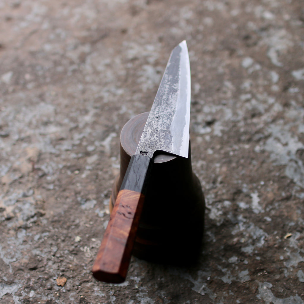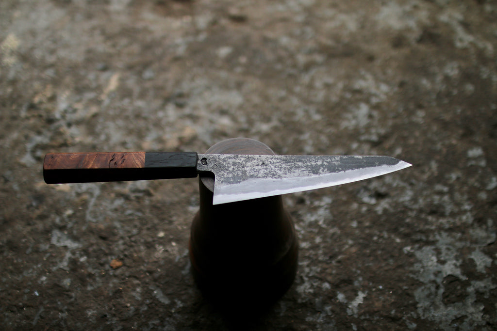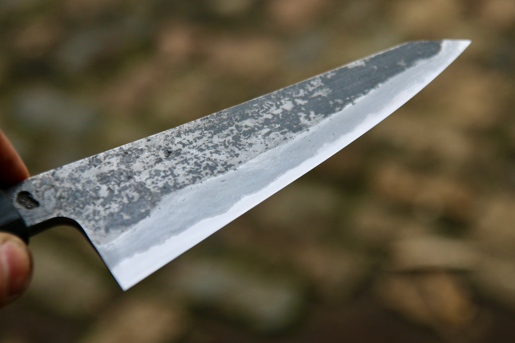 My blades are made from carbon steel not stainless steel, it gives my knives an unbeatable sharpness. I prefer carbon steel for it ease to sharpen, the fine edge it takes and the beautiful patina that will develop. You do, however, need to give carbon steel knives just a little extra care to keep them in top shape. There are trade-offs in everything. Dirty wrought iron claddings are very reactive.