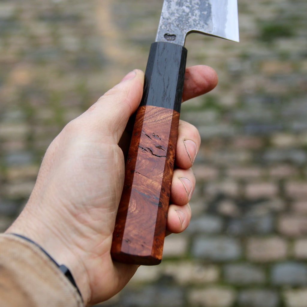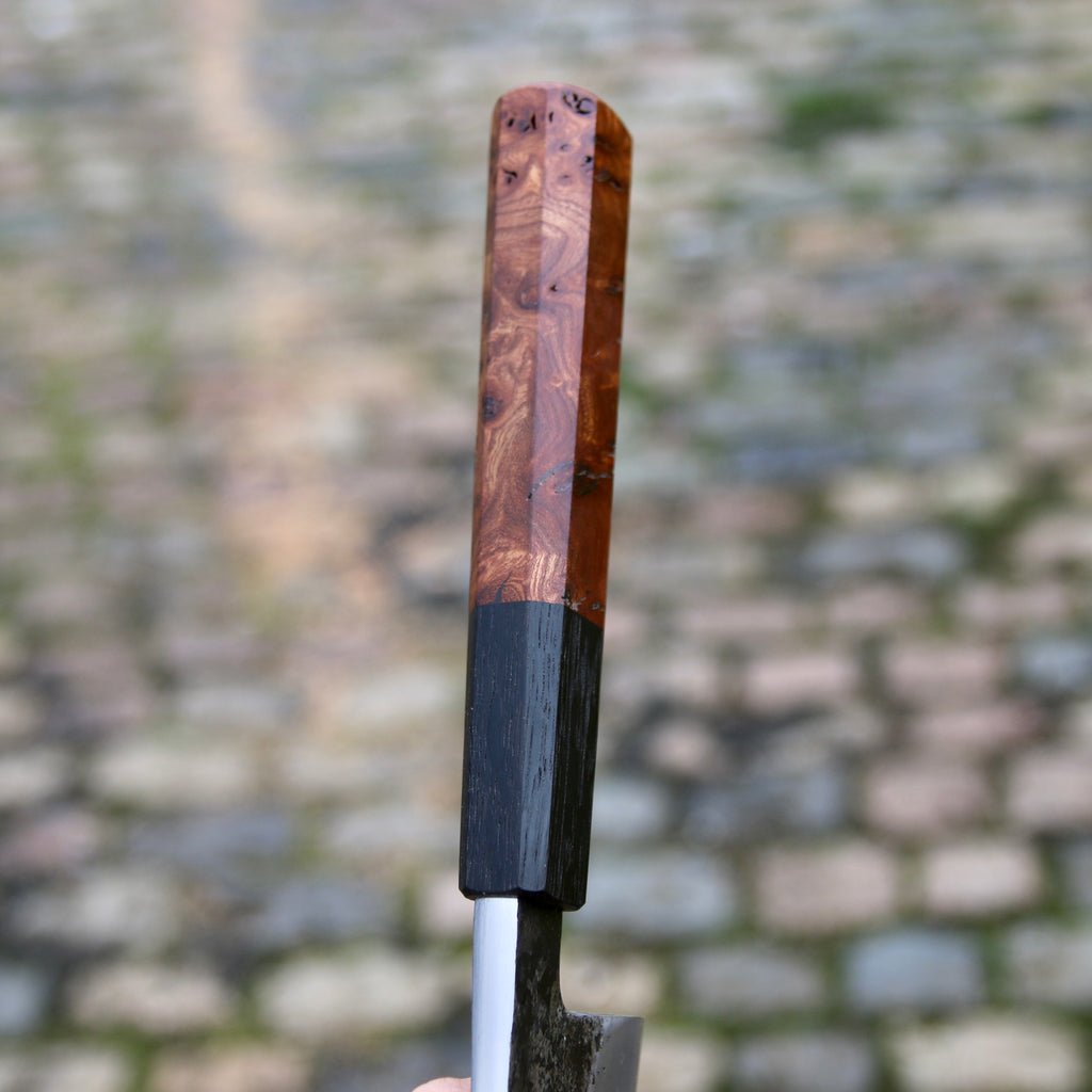 This Gyuto (Japanese chef knife) feature a flat profile, K-tip, thick Emoto with a very heavy distal taper and a thin tip. Not my usual work, this blade is slightly hollow forged. Shop made san-maï with Spicy white 26C3 core steel and historic wrought iron cladding. Forged to shape and to geometry the bevels are ground on whetstone with a Kasumi-ish finish (Shobudani). The handle is made with Bog Oak and burl Elm.
