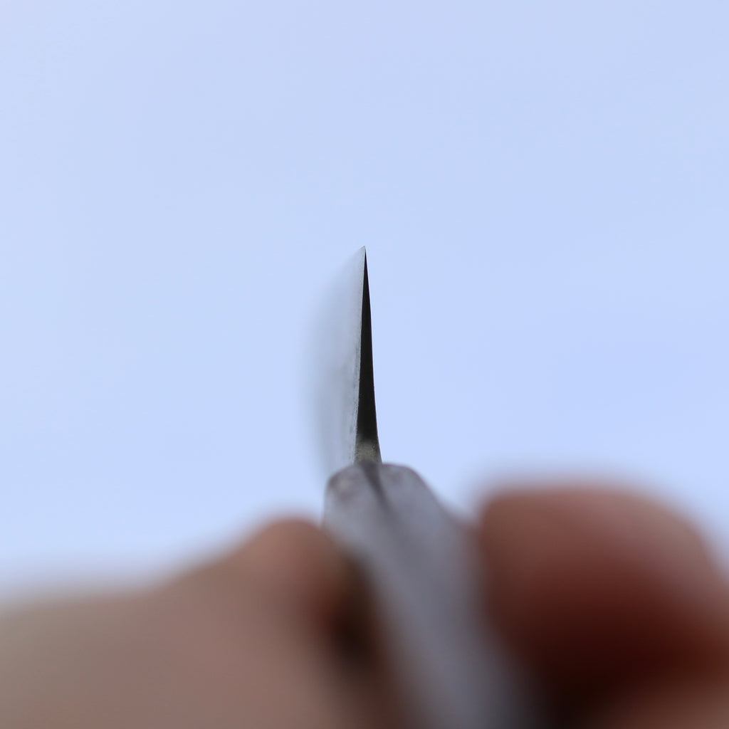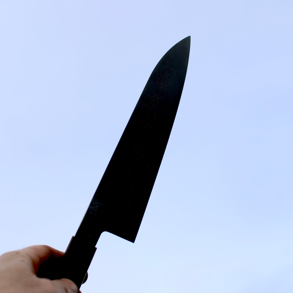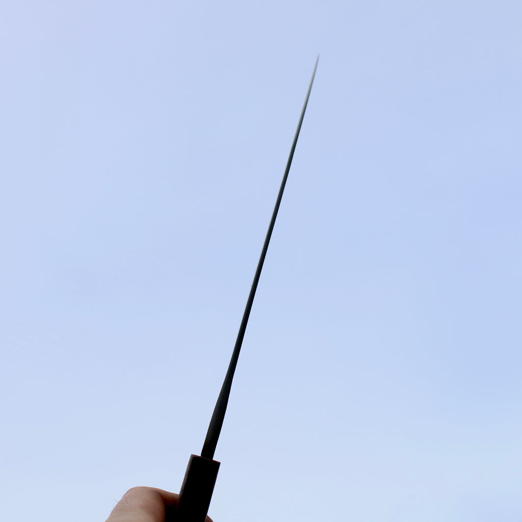 This Gyuto feature a medium size blade, good distal taper, and thin tip. Flat profile with a slight curve toward the tip. The san-mai is made from 26C3 core steel with soft steel cladding. Forged to shape and to geometry the blade is ground on water cooled grinding stone with a satin finish. Interesting taper from 6mm at the emoto to rapidly 2mm, to 1mm at the tip.