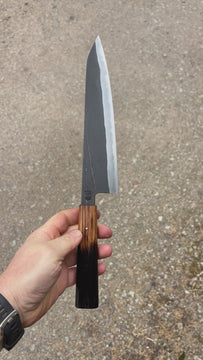 This Tetsu Gyuto feature a medium size blade, good distal taper, thin tip. Flat profile from the heel with a curve toward the tip. The San-mai is laminated by myself in house. Forged to shape and to geometry the blade is ground on water cooled grinding wheel then finish by hand on bench stone. I added 2 layers of nickel within the wrought .