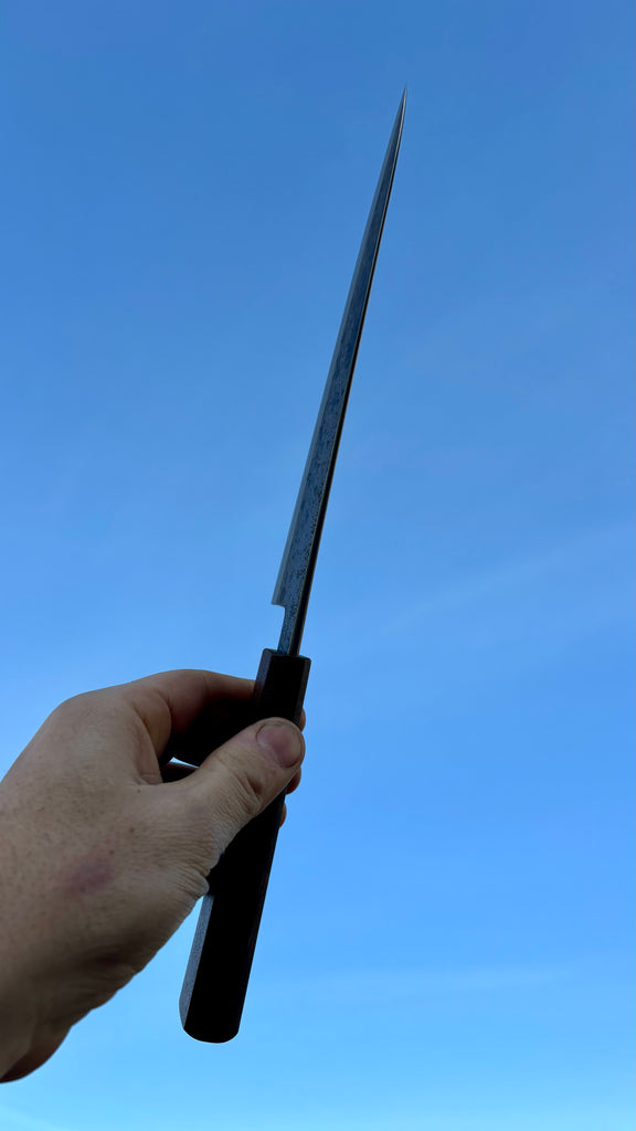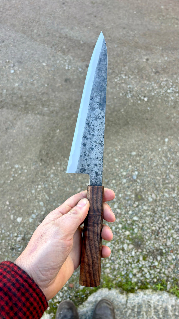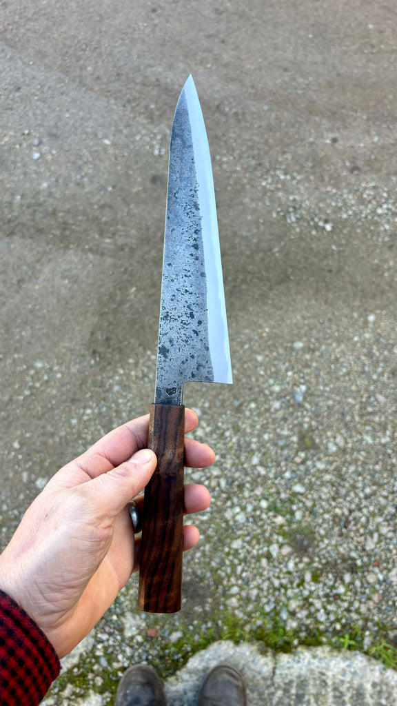 This Nishiji Gyuto feature a medium size blade, good distal taper, and thin tip. Flat profile with a slight curve toward the tip. The San-mai is made from 135Cr3 steel core with soft steel cladding. Forged to shape and to geometry the blade is ground on water cooled grinding wheel with a satin finish.