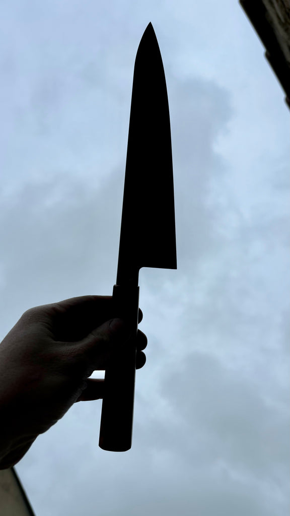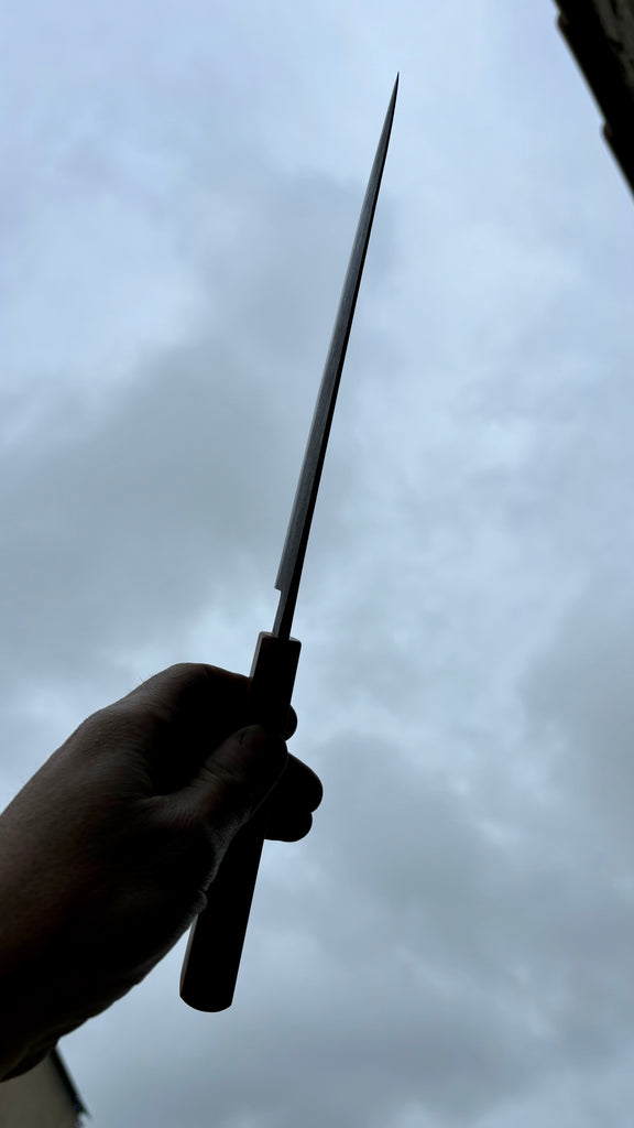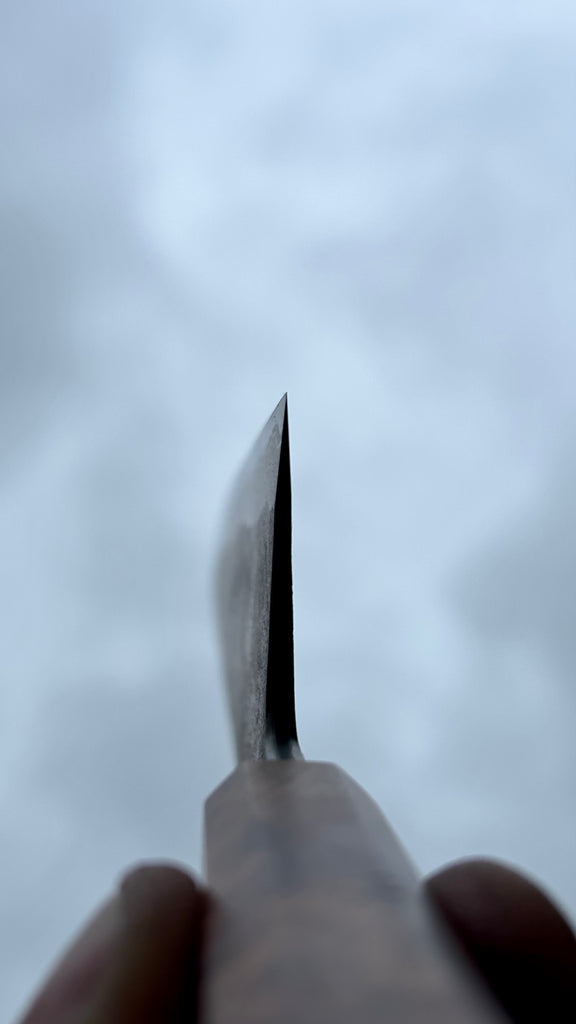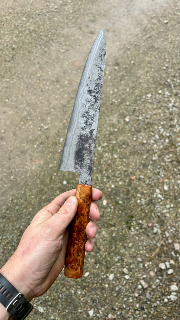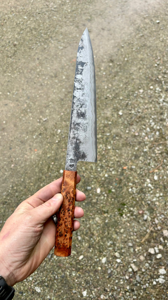 This Suminagashi Gyuto feature a medium size blade, good distal taper, and thin tip. Flat profile at the heel with a slight curve toward the tip. The San-mai is made from 135Cr3 steel core with suminagashi cladding. Forged to shape and to geometry the blade is ground on water cooled grinding wheel.