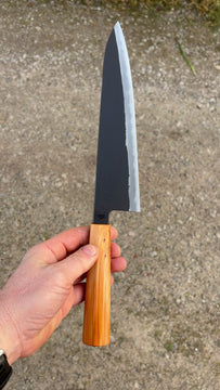 This Nishiji Gyuto feature a medium size blade, good distal taper, thin tip. Flat profile at the heel with a slight curve toward the tip. The San-mai is laminated by myself in house. Forged to shape and to geometry the blade is ground on water cooled grinding wheel.