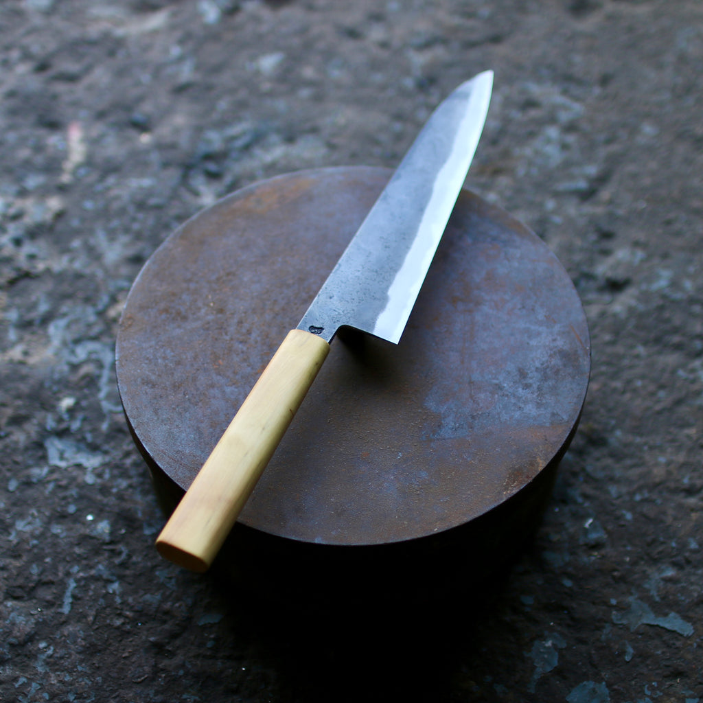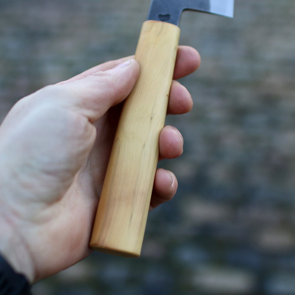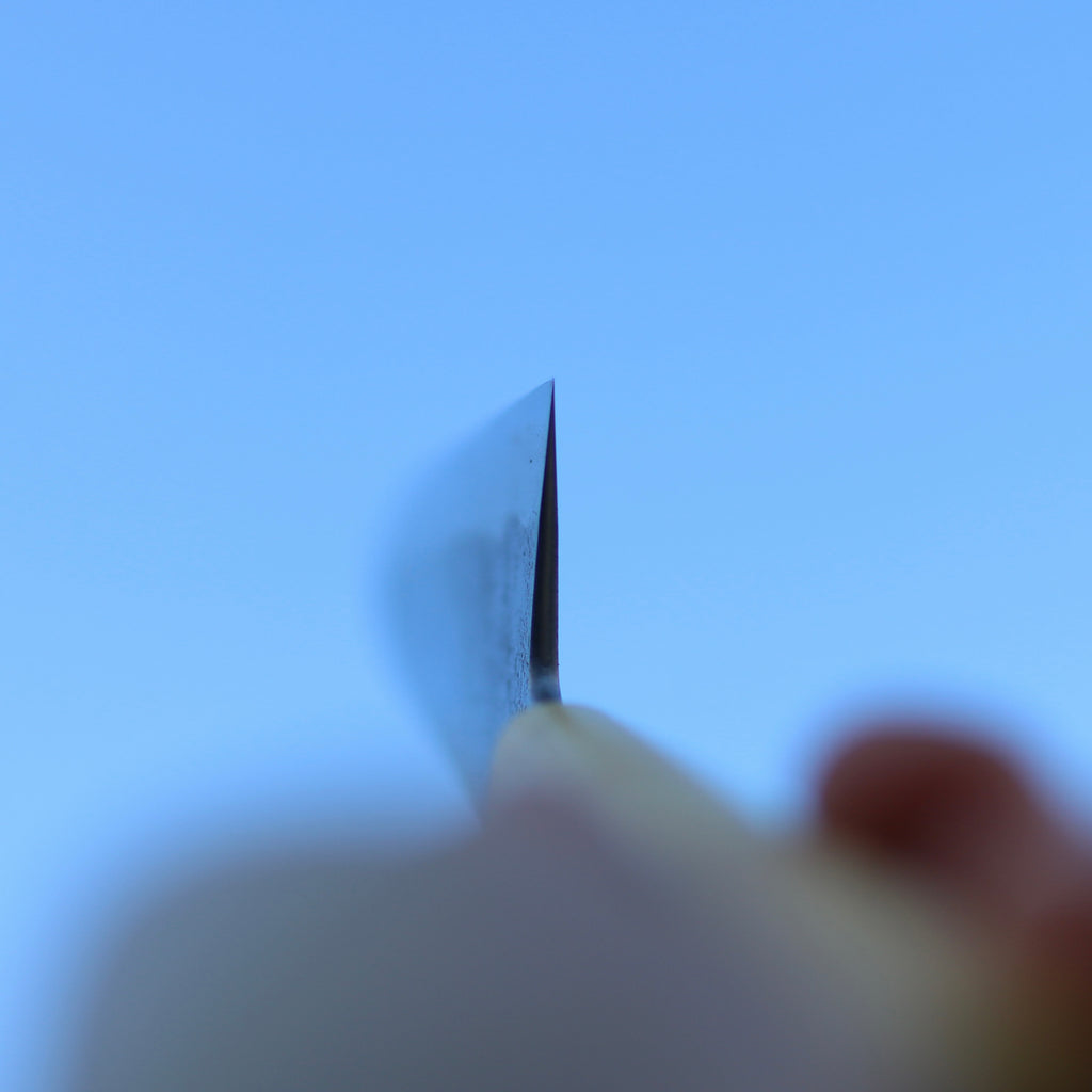 When stated, my knives bevels are ground and polished with Japanese whetstones. This allow an easy maintenance at home. For Sharpening service please contact Scott from www.sheffieldknifesharpening.com