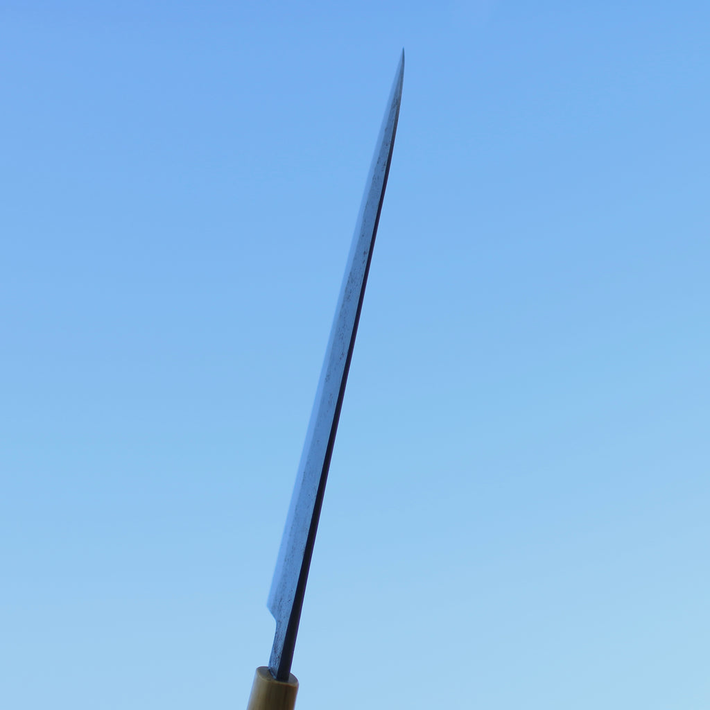 This Nashiji Gyuto feature a medium size blade, good distal taper, and thin tip. Flat profile with a slight curve toward the tip. The san-mai is made from 135Cr3 core steel with soft steel cladding. Forged to shape and to geometry the bevels are ground on water cooled grinding stone with a satin finish.