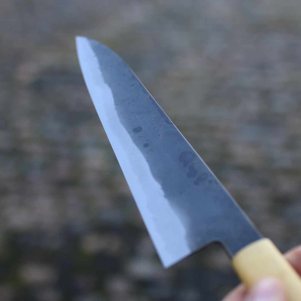 My blades are made from carbon steel not stainless steel, it gives my knives an unbeatable sharpness. I prefer carbon steel for it ease to sharpen, the fine edge it takes and the beautiful patina that will develop. You do, however, need to give carbon steel knives just a little extra care to keep them in top shape. There are trade-offs in everything. Claddings stated as "dirty wrought iron" will be very reactive.