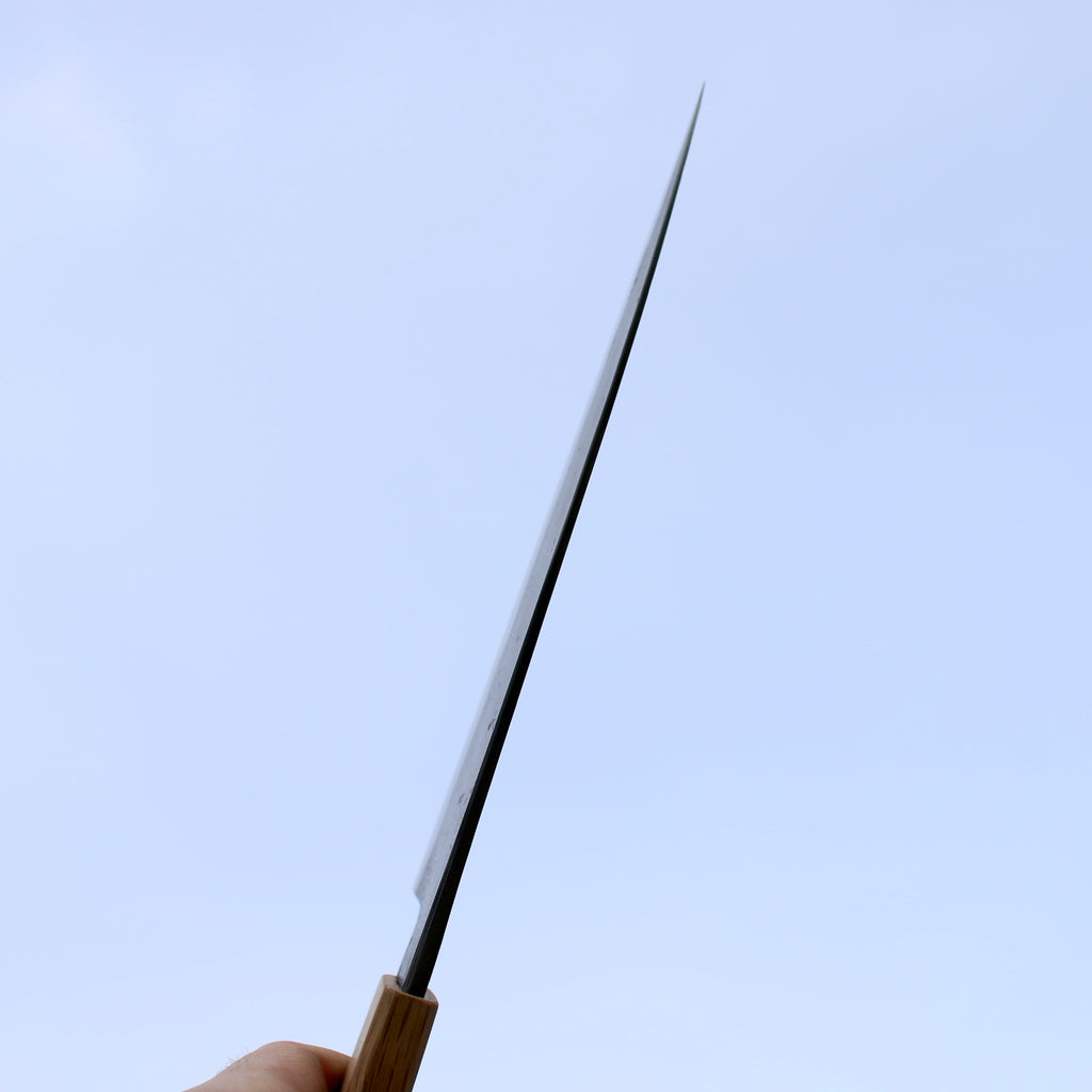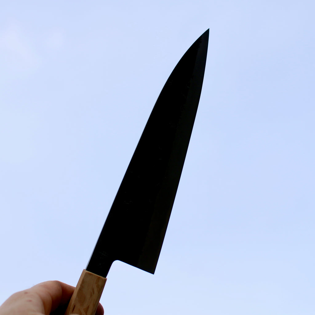 This Gyuto feature a medium size blade, good distal taper, and thin tip. Flat profile with a slight curve toward the tip. The san-mai is made from 52100 core steel with soft iron cladding. Forged to shape and to geometry the blade is ground on water cooled grinding stone with a stone finish.