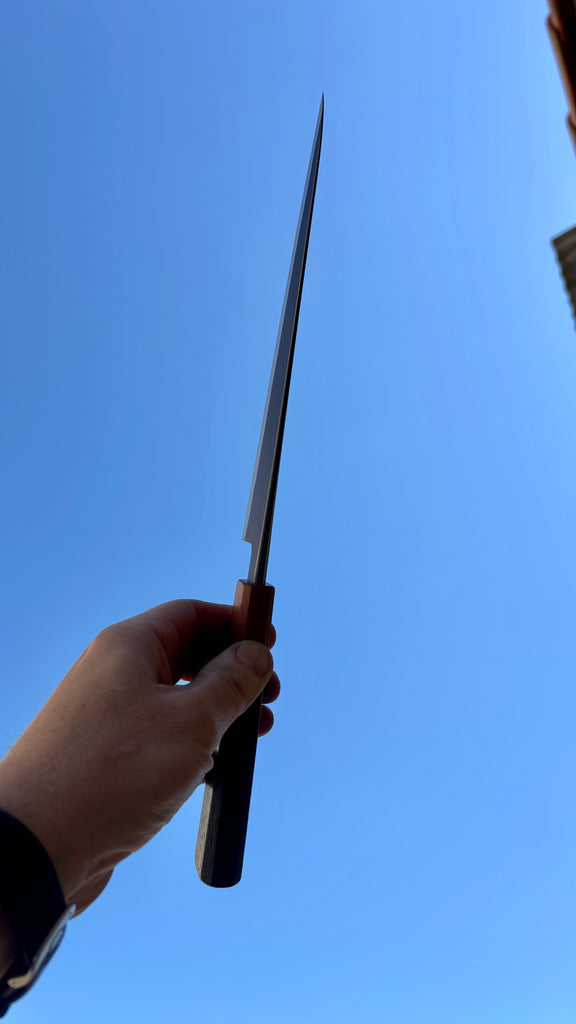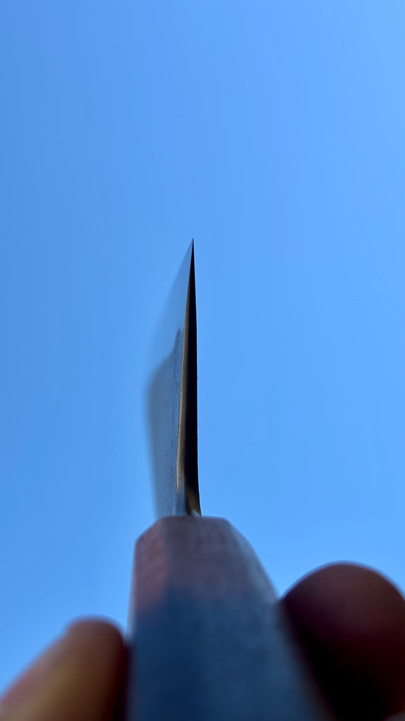 This Nishiji KU Gyuto feature a medium size blade, good distal taper, thin tip. Flat profile at the heel with a slight curve toward the tip. The San-mai is made from 135Cr3 steel core with soft steel cladding. Forged to shape and to geometry the blade is ground on water cooled grinding wheel.
