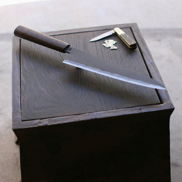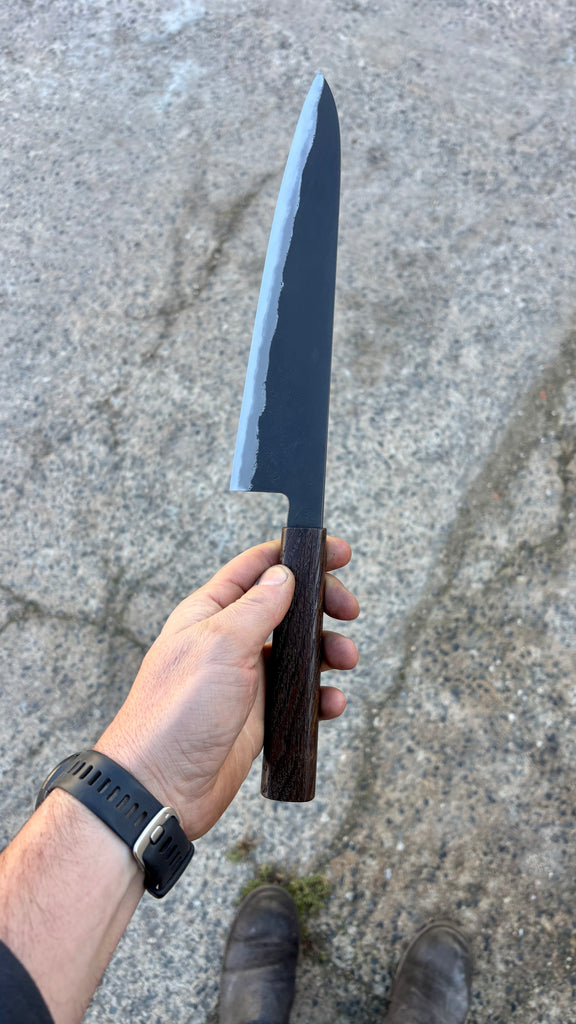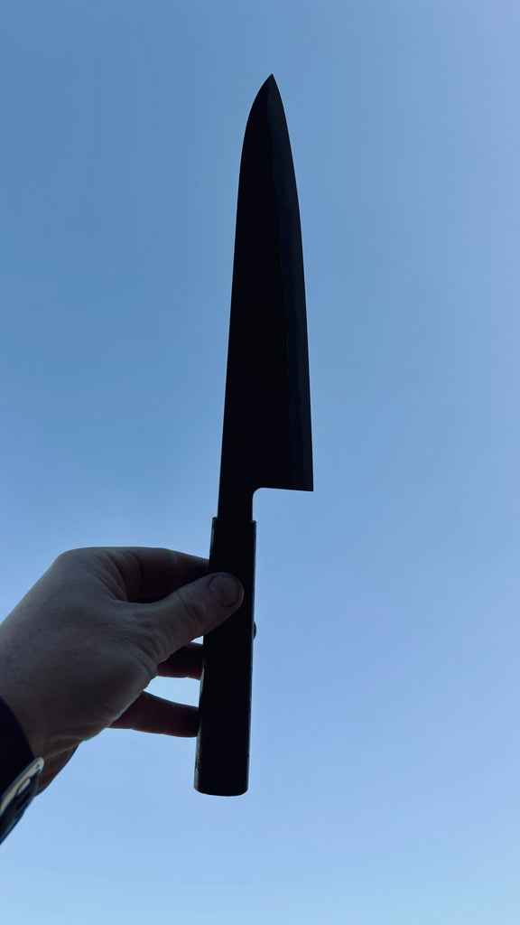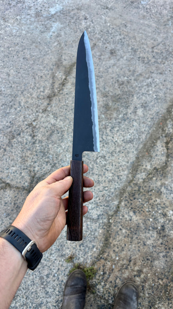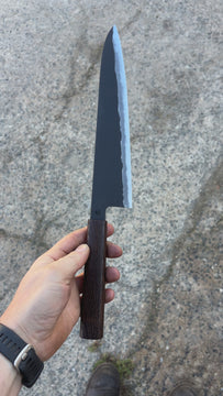 This Gyuto Shefu feature a medium size blade, good distal taper, thin tip. Flat profile at the heel with a slight curve toward the tip. The San-mai is laminated by myself in house. Forged to shape and to geometry the blade is ground on water cooled grinding wheel.