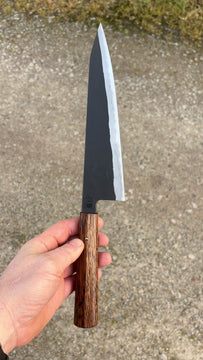 This Tetsu Gyuto feature a medium size blade, good distal taper, thin tip. Flat profile at the heel with a slight curve toward the tip. The San-mai is laminated by myself in house. Forged to shape and to geometry the blade is ground on water cooled grinding wheel.