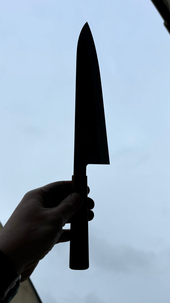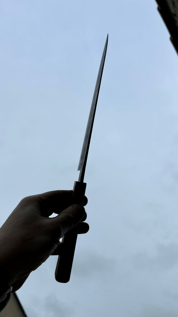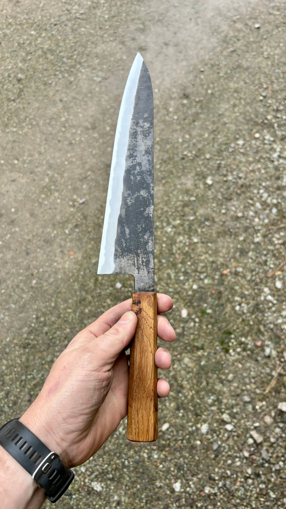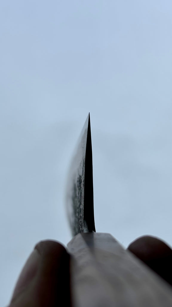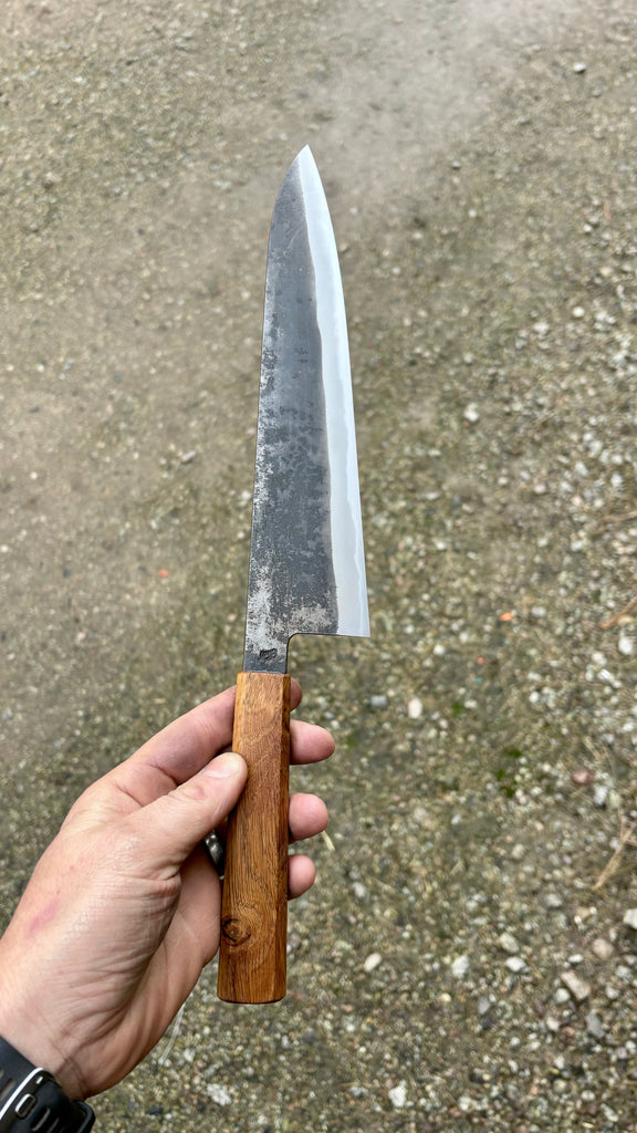 This Nishiji Gyuto feature a long and tall blade, good distal taper, and thin tip. Flat profile at the heel with a slight curve toward the tip. The San-mai is made from 26C3 steel core with soft steel cladding. Forged to shape and to geometry the blade is ground on water cooled grinding wheel.
