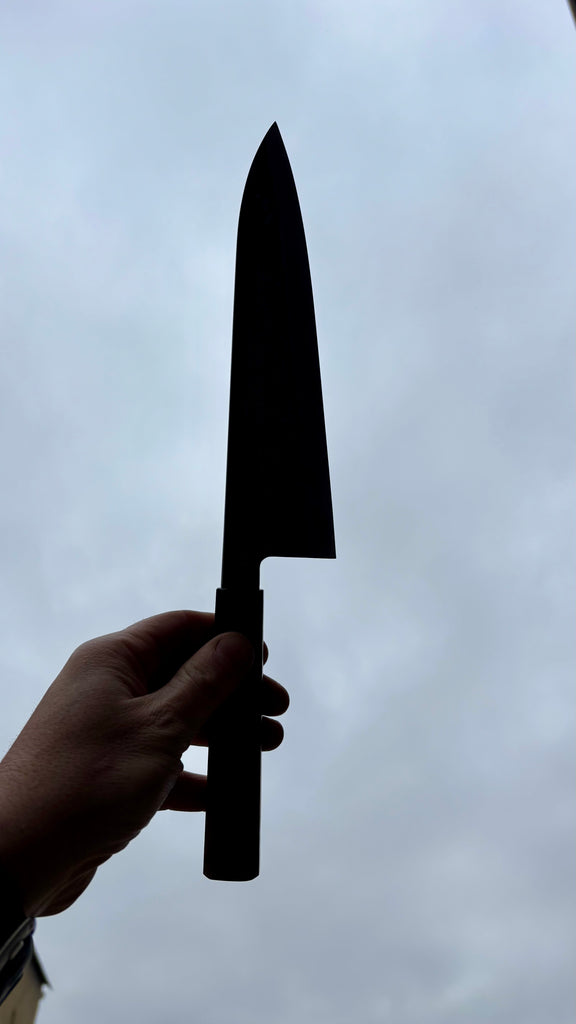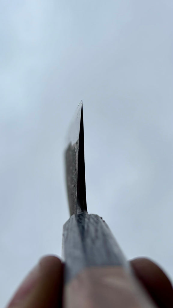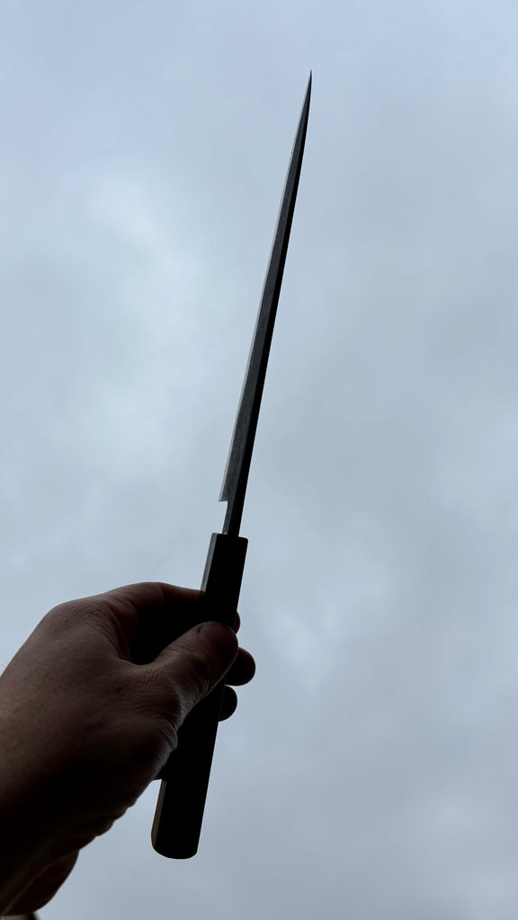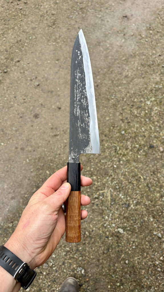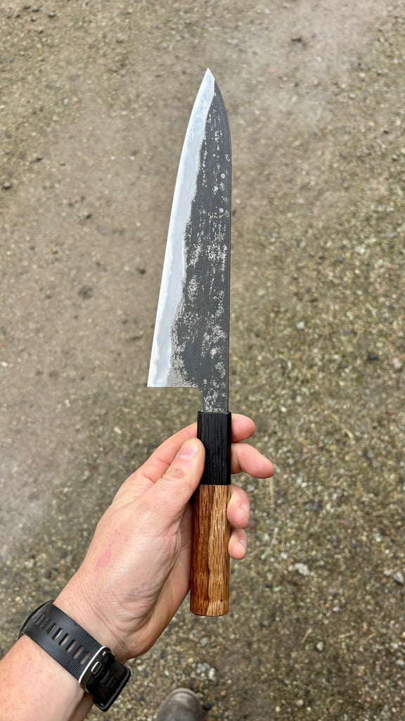 This Tetsu Gyuto is the first knife made 100% in my new shop, it feature a medium size blade, good distal taper, and thin tip. Flat profile at the heel with a slight curve toward the tip. The San-mai is made from 135Cr3 steel core with wrought iron cladding. Forged to shape and to geometry the blade is ground on water cooled grinding wheel.