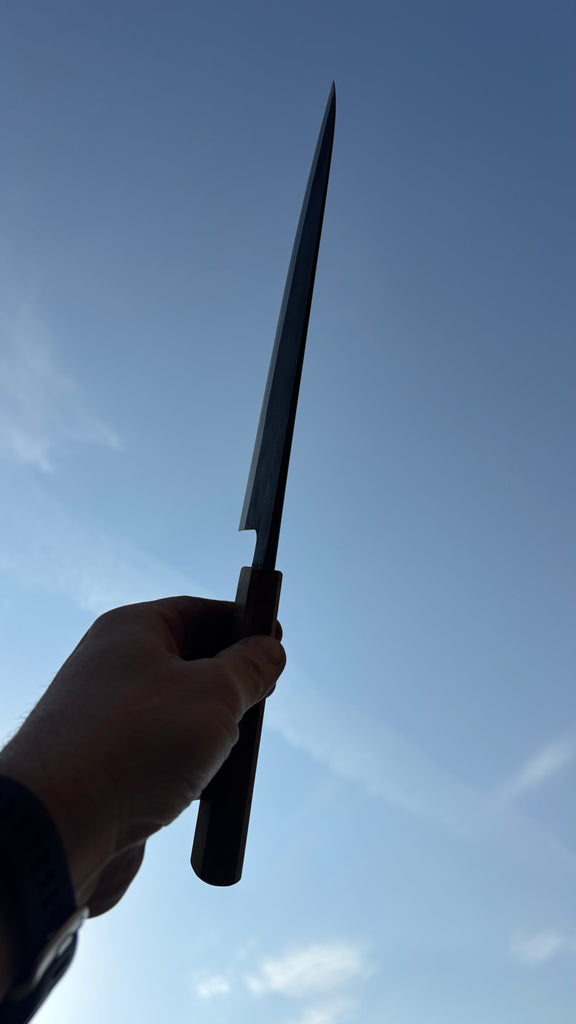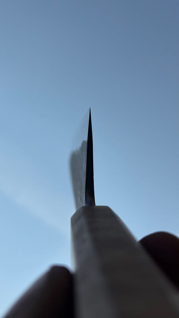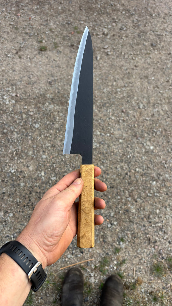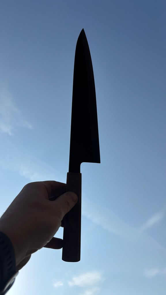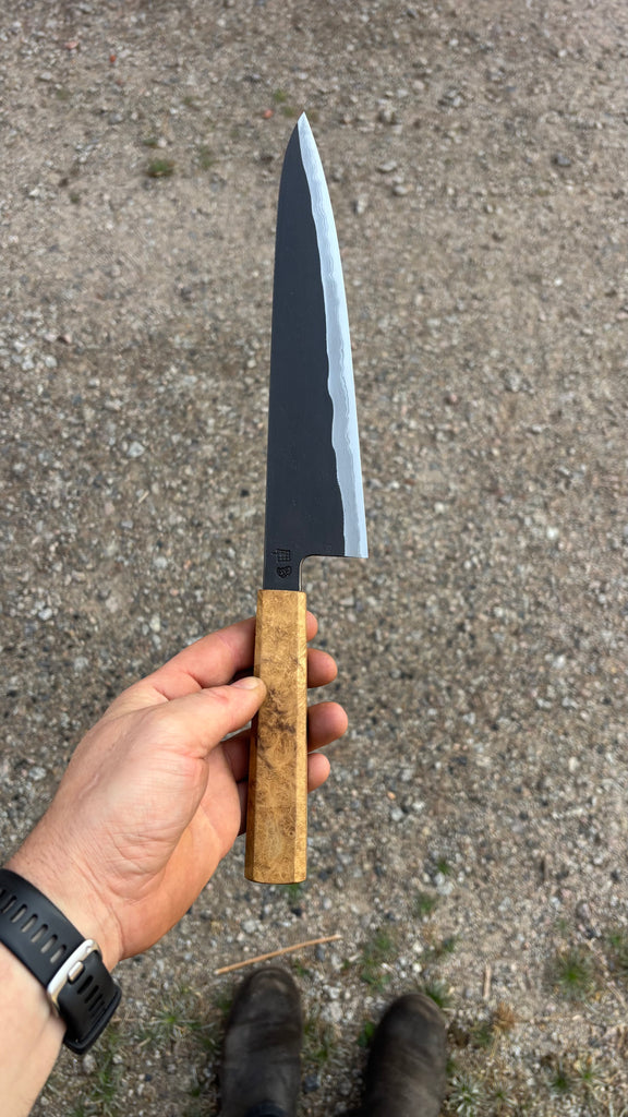This Tetsu Gyuto feature a long blade, good distal taper, thin tip. Flat profile at the heel with a light curve toward the tip. The San-mai is made from 135Cr3 steel core with Wrought iron cladding. Forged to shape and to geometry the blade is ground on water cooled grinding wheel.
