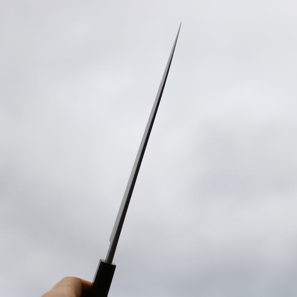 This Gyuto feature a long blade, good distal taper, and thin tip. Flat profile with a slight curve toward the tip. The san-mai is made from 52100 steel core with wrought iron cladding. Forged to shape and to geometry the blade is ground on water cooled grinding wheel with a stone finish.