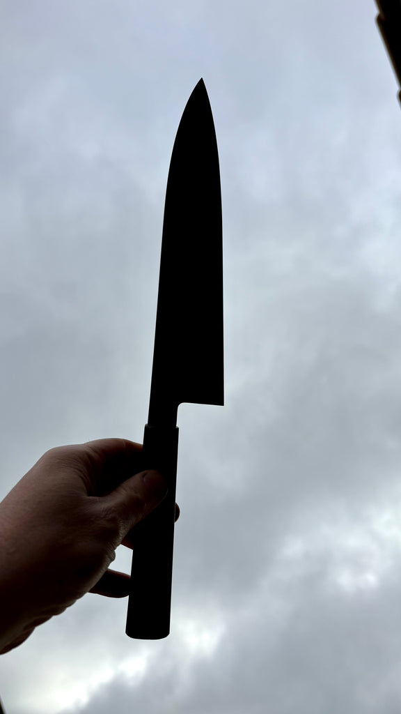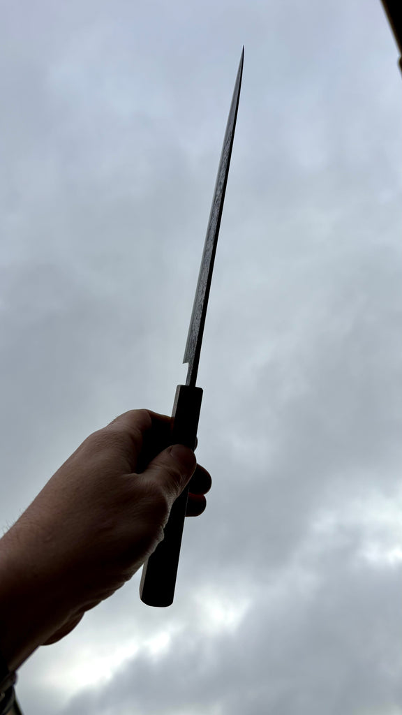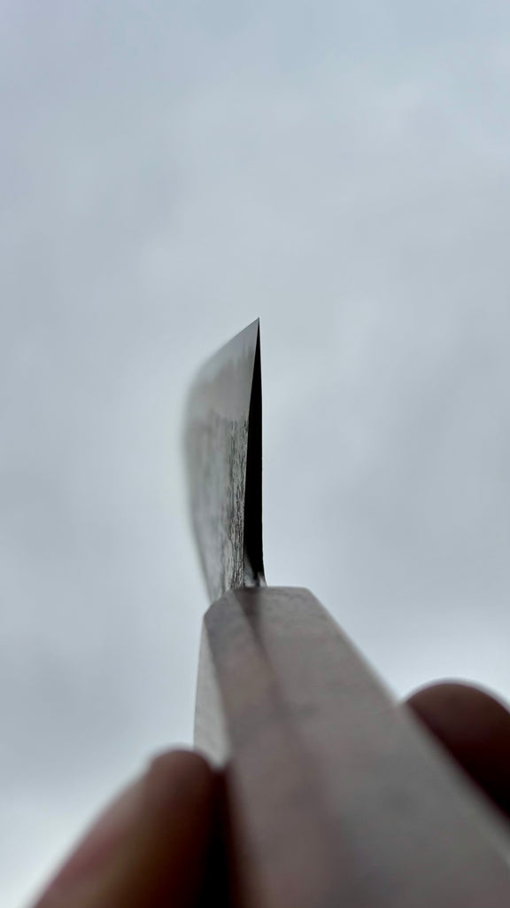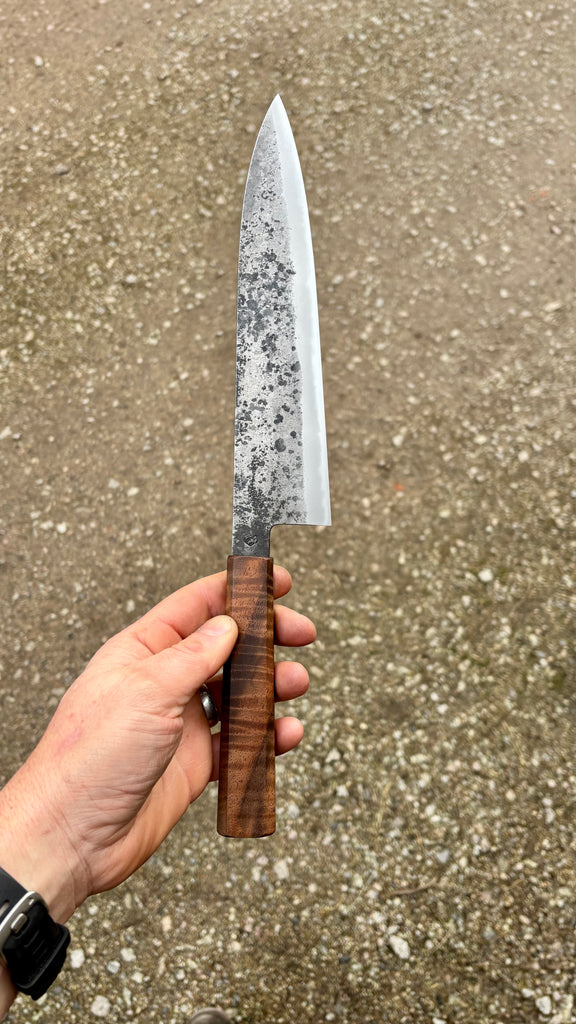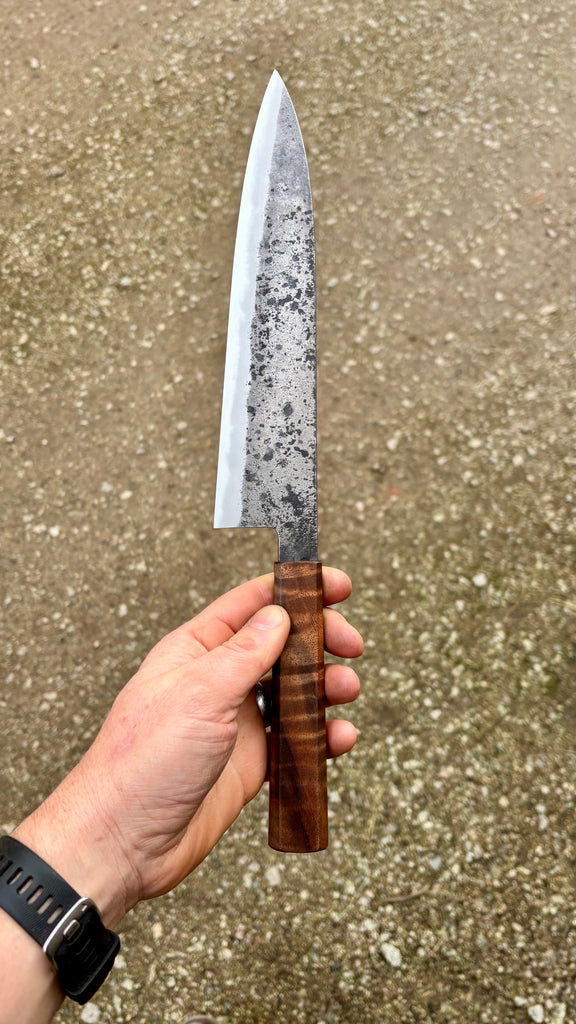 This Nishiji Gyuto feature a medium size blade, good distal taper, and thin tip. Flat profile at the heel with a slight curve toward the tip. The San-mai is made from 135Cr3 steel core with soft steel cladding. Forged to shape and to geometry the blade is ground on water cooled grinding wheel.