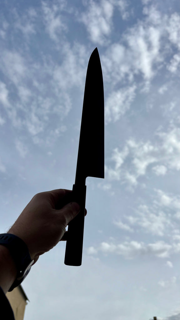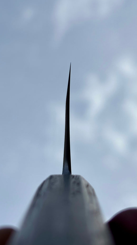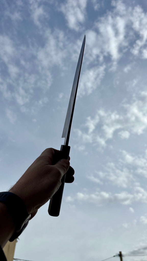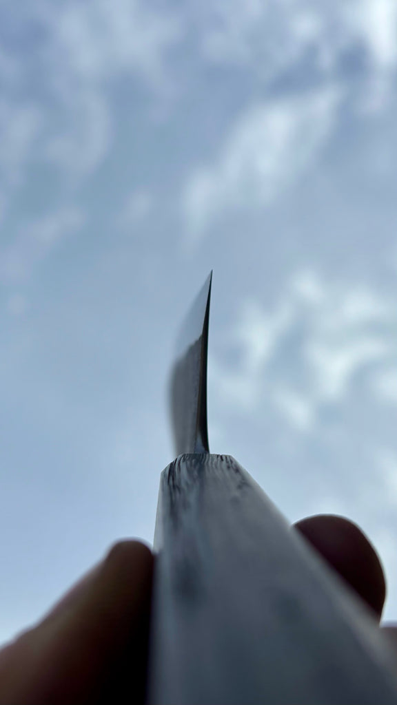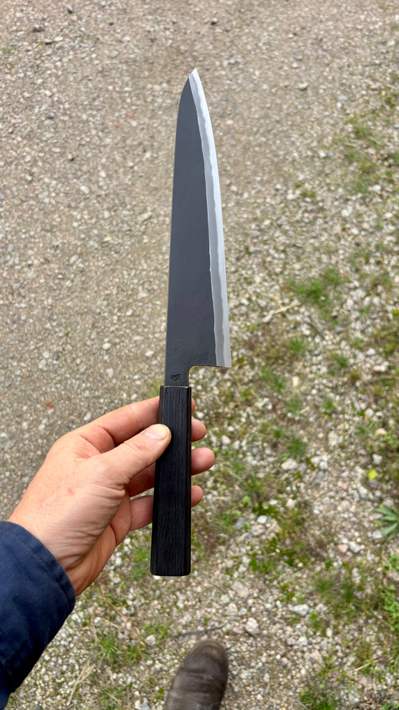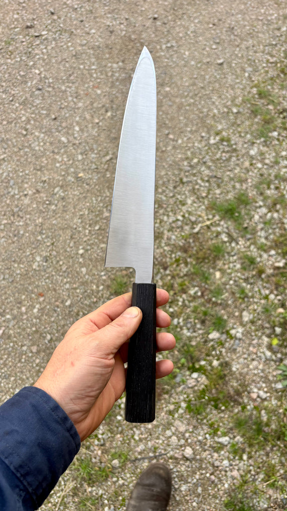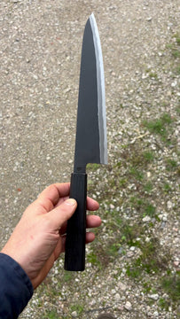 This Single bevel Gyuto feature a long blade, very good distal taper, thin tip. Flat profile at the heel with a slight curve toward the tip. The Ni-mai is laminated by myself in house. Forged to shape and to geometry the blade is ground on water cooled grinding wheel.