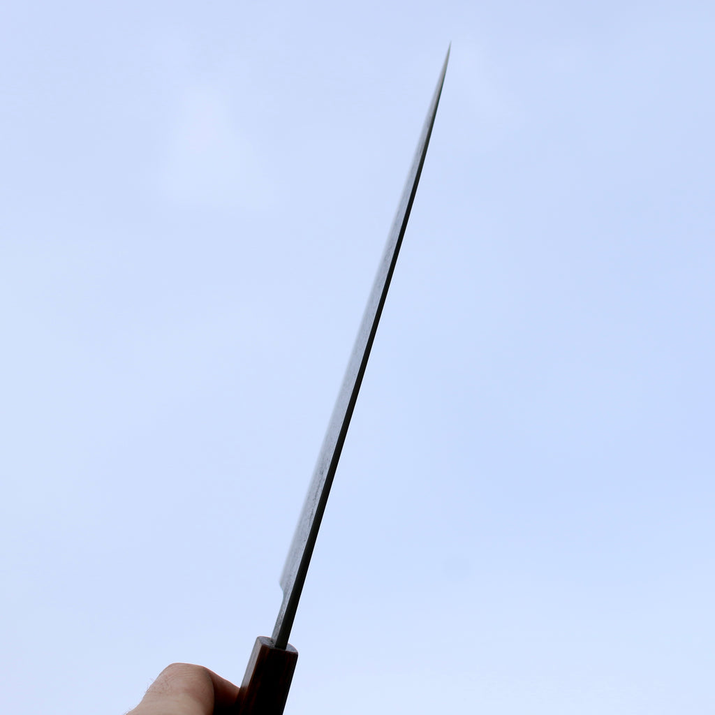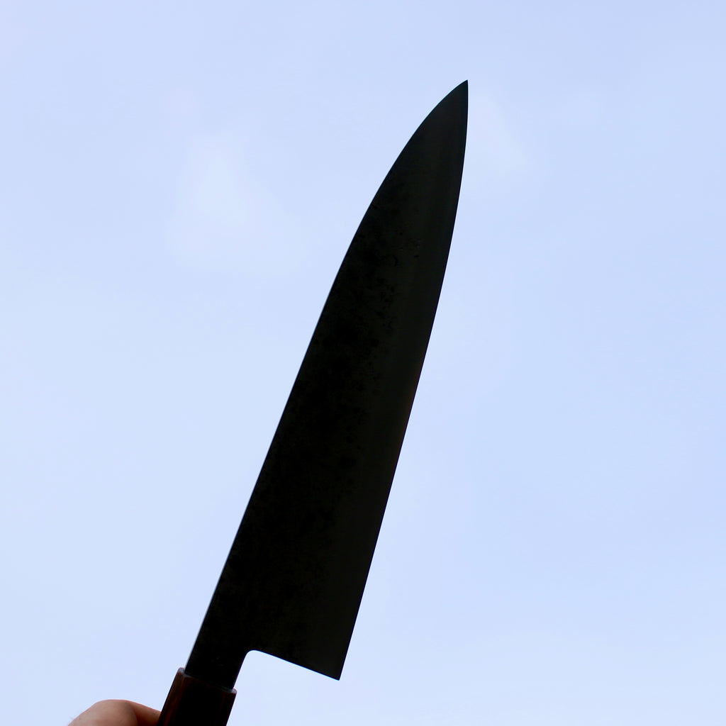This Gyuto feature a long blade, good distal taper, and thin tip. Flat profile with a slight curve toward the tip. The san-mai is made from 135Cr3 core steel with soft steel cladding. Forged to shape and to geometry the blade is ground on water cooled grinding stone with a satin finish.
