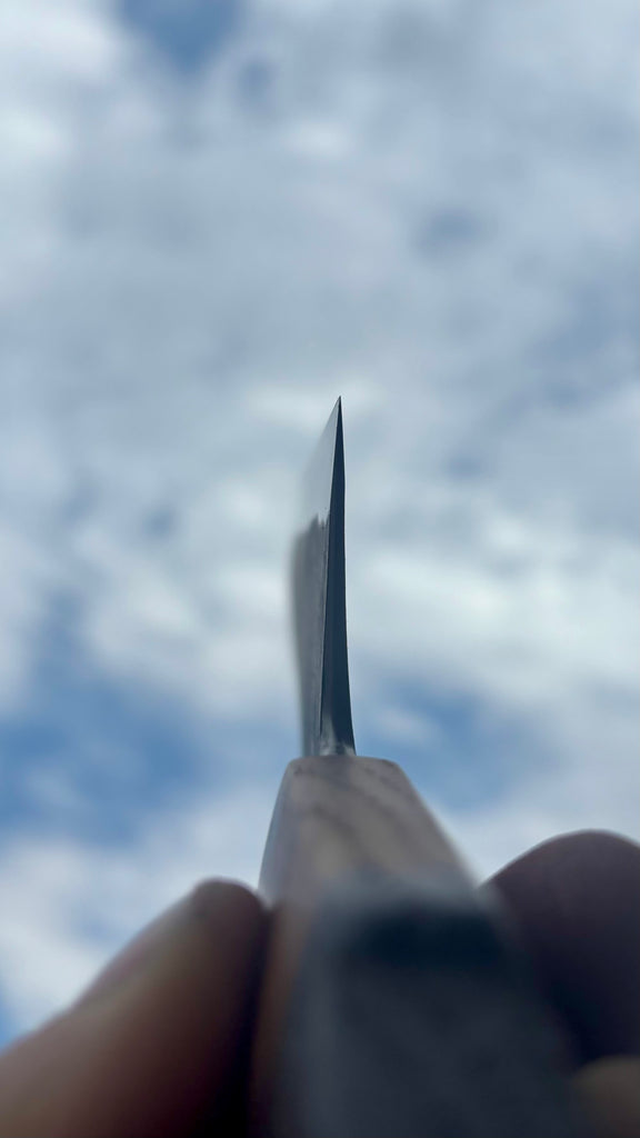 This Tetsu Gyuto feature a medium size blade, good distal taper, thin tip. Flat profile at the heel with a slight curve toward the tip. The San-mai is made from 135Cr3 steel core with vintage soft iron cladding. Forged to shape and to geometry the blade is ground on water cooled grinding wheel.