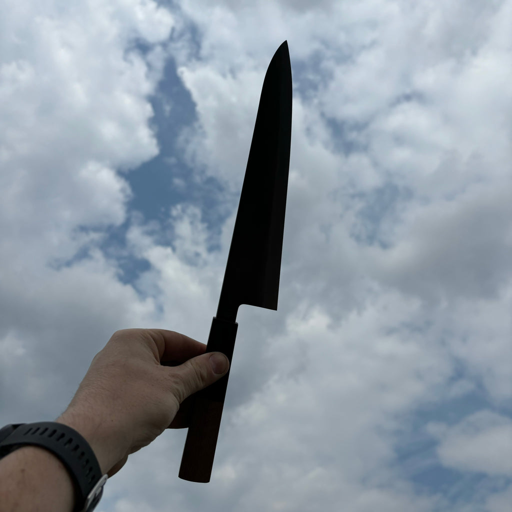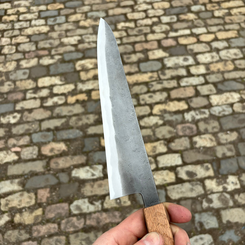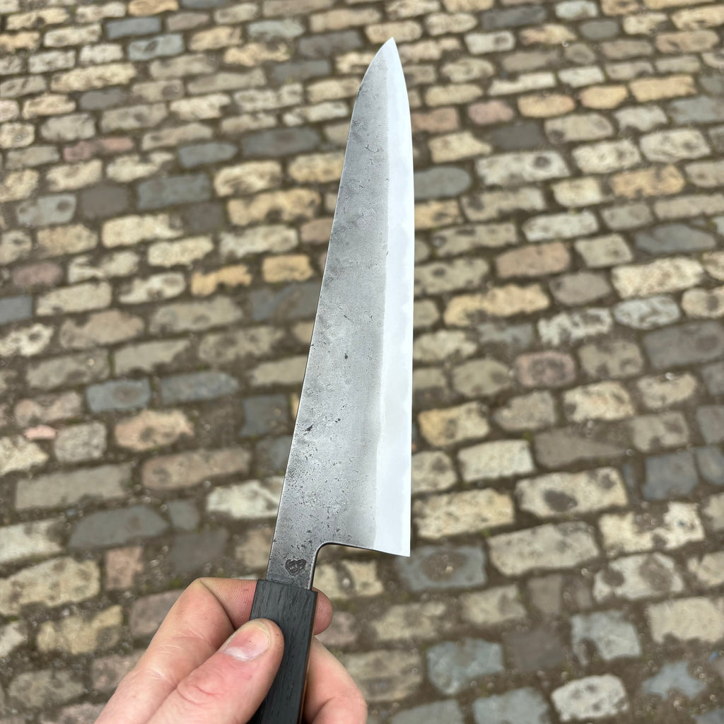 This Gyuto feature a long blade, good distal taper, and thin tip. Flat profile with a slight curve toward the tip. The san-mai is made from 135Cr3 steel core with soft steel cladding. Forged to shape and to geometry the blade is ground on water cooled grinding wheel with a blasted satin finish.