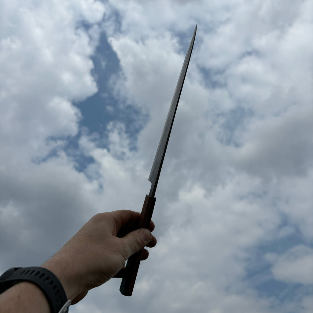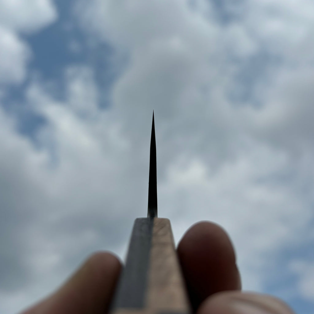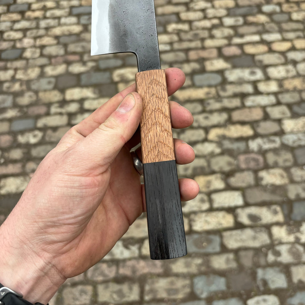 This Gyuto feature a long blade, good distal taper, and thin tip. Flat profile with a slight curve toward the tip. The san-mai is made from 135Cr3 steel core with soft steel cladding. Forged to shape and to geometry the blade is ground on water cooled grinding wheel with a blasted satin finish.