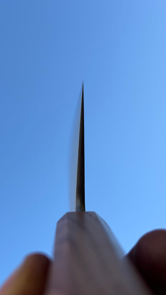 This Tetsu fully ground Gyuto feature a medium size blade, good distal taper, and thin tip. Flat profile at the heel with a slight curve toward the tip. The San-mai is made from 115CrV3 steel core with wrought iron cladding. Forged to shape and to geometry the blade is ground on water cooled grinding wheel.