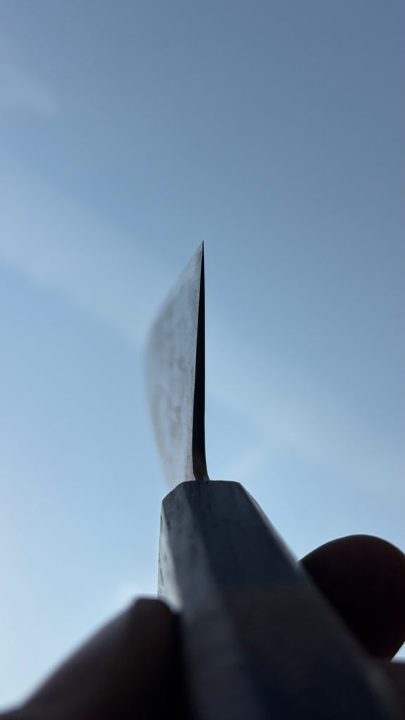 This Seiko Gyuto feature a long blade, good distal taper, thin tip. Flat profile at the heel with a strong curve toward the tip. The San-mai is made from V-Toku 2 steel core with Rainbow damascus cladding. Forged to shape and to geometry the blade is ground on water cooled grinding wheel.