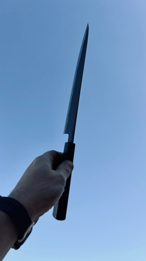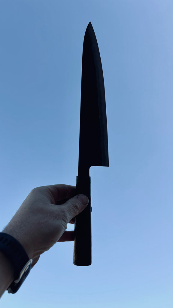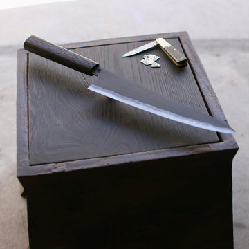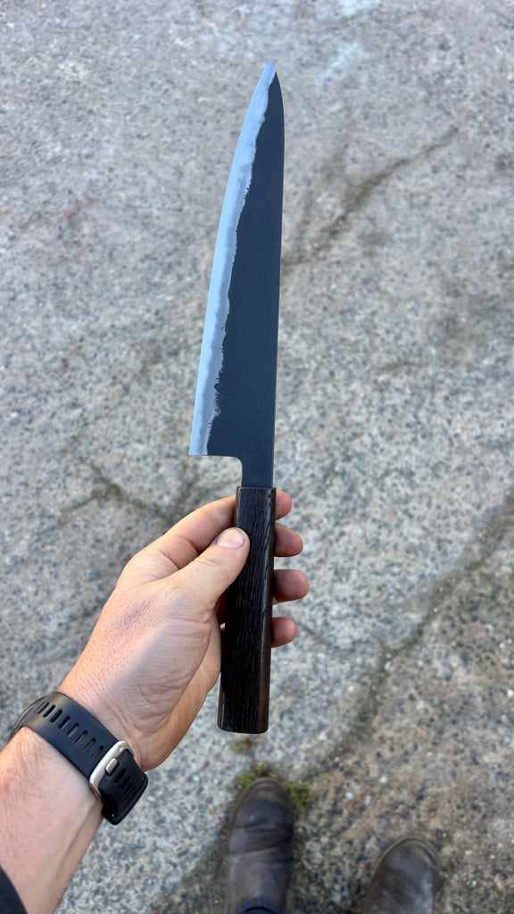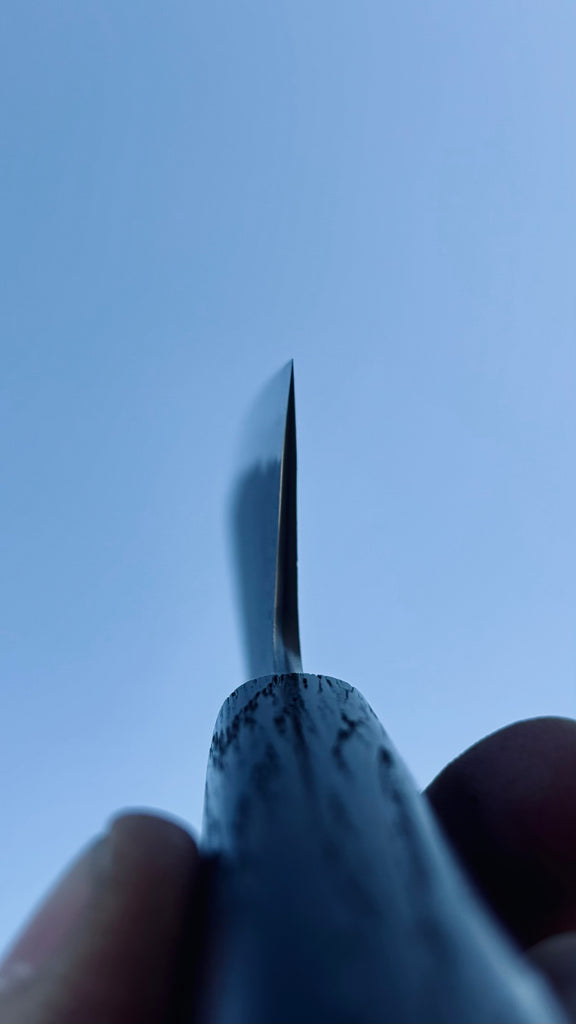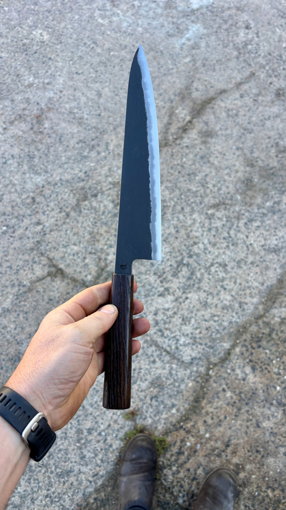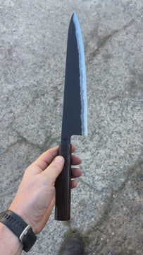 This Gyuto Shefu feature a long blade, good distal taper, thin tip. Flat profile at the heel with a slight curve toward the tip. The San-mai is laminated by myself in house. Forged to shape and to geometry the blade is ground on water cooled grinding wheel.