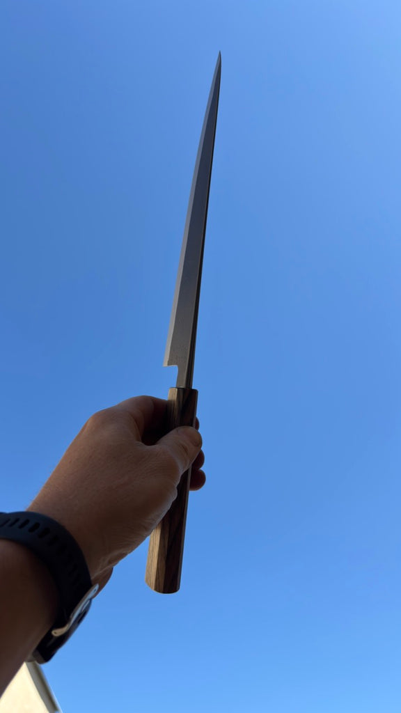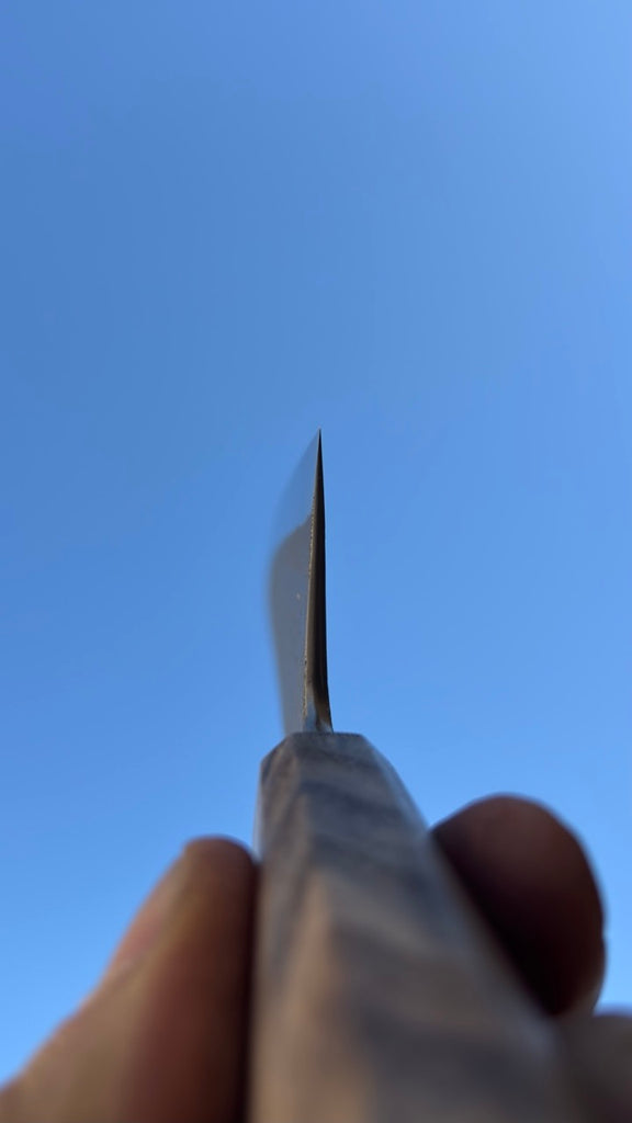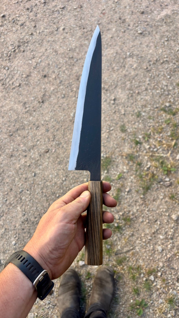 This Nishiji Gyuto feature a long blade, good distal taper, thin tip. Flat profile at the heel with a slight curve toward the tip. The San-mai is made from 135Cr3 steel core with soft steell cladding. Forged to shape and to geometry the blade is ground on water cooled grinding wheel.