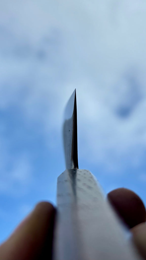 This Nishiji Gyuto feature a long blade, good distal taper, thin tip. Flat profile at the heel with a slight curve toward the tip. The San-mai is made from 135Cr3 steel core with soft steel cladding. Forged to shape and to geometry the blade is ground on water cooled grinding wheel.