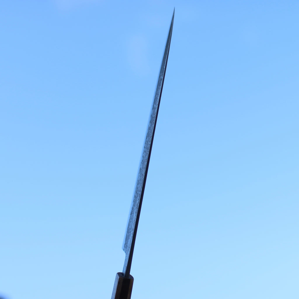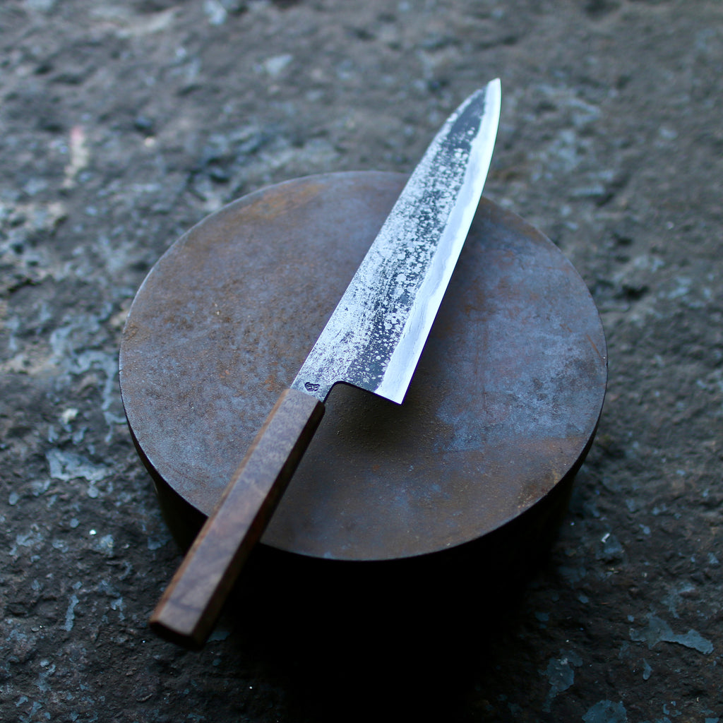 This Tetsu Gyuto feature a long blade, good distal taper, and thin tip. Flat profile with a slight curve toward the tip. The san-mai is made from 115Cr3 core steel with vntage wrought iron cladding. Forged to shape and to geometry the bevels are ground on water cooled grinding stone with a Kasumi finish.