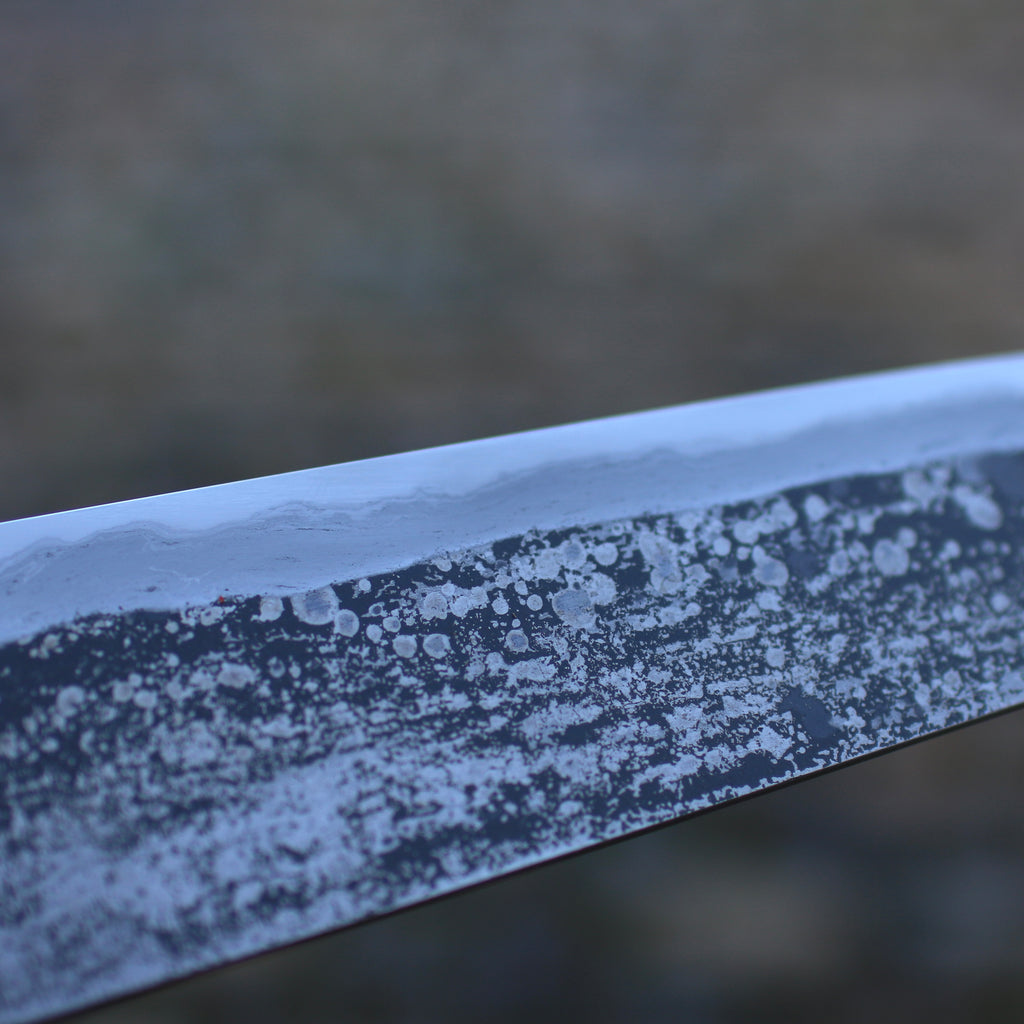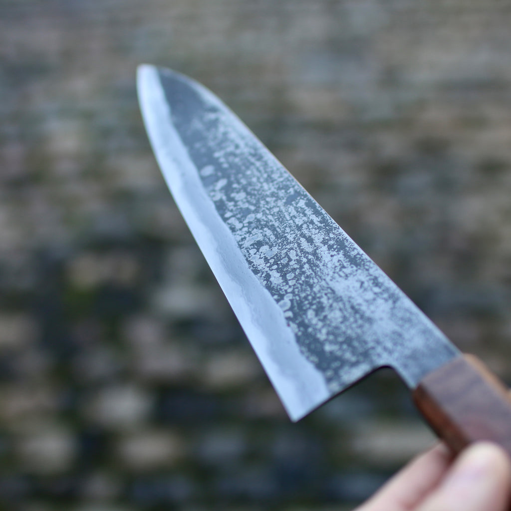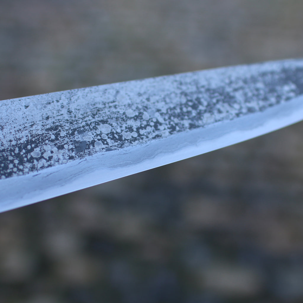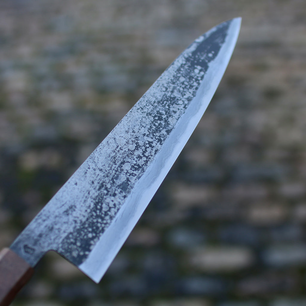 My blades are made from carbon steel not stainless steel, it gives my knives an unbeatable sharpness. I prefer carbon steel for it ease to sharpen, the fine edge it takes and the beautiful patina that will develop. You do, however, need to give carbon steel knives just a little extra care to keep them in top shape. There are trade-offs in everything. Claddings stated as "dirty wrought iron" will be very reactive.
