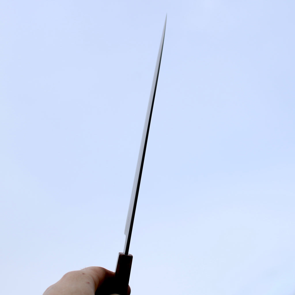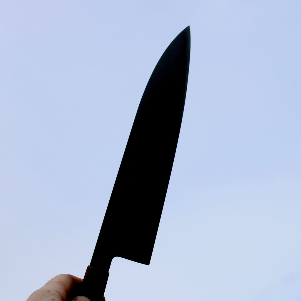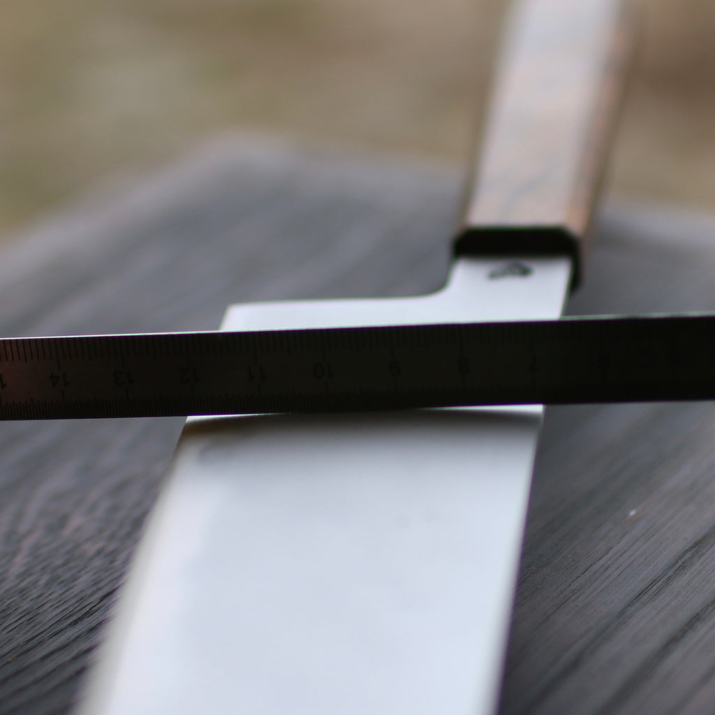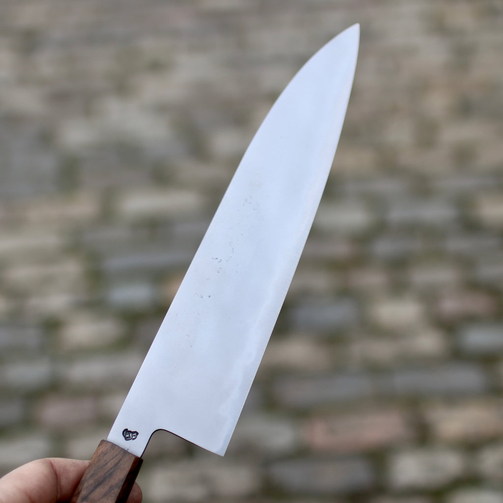 This fully ground Gyuto feature a long blade, good distal taper, and thin geometry. Flat profile with a slight curve toward the tip. The san-mai is made from 135Cr3 core steel with soft steel cladding. Forged to shape and to geometry the blade is ground on water cooled grinding stone then polished on a rotary platten with a satin finish. Great performer with improved food release.