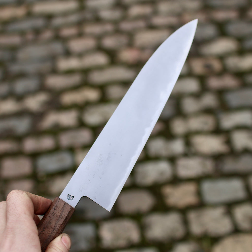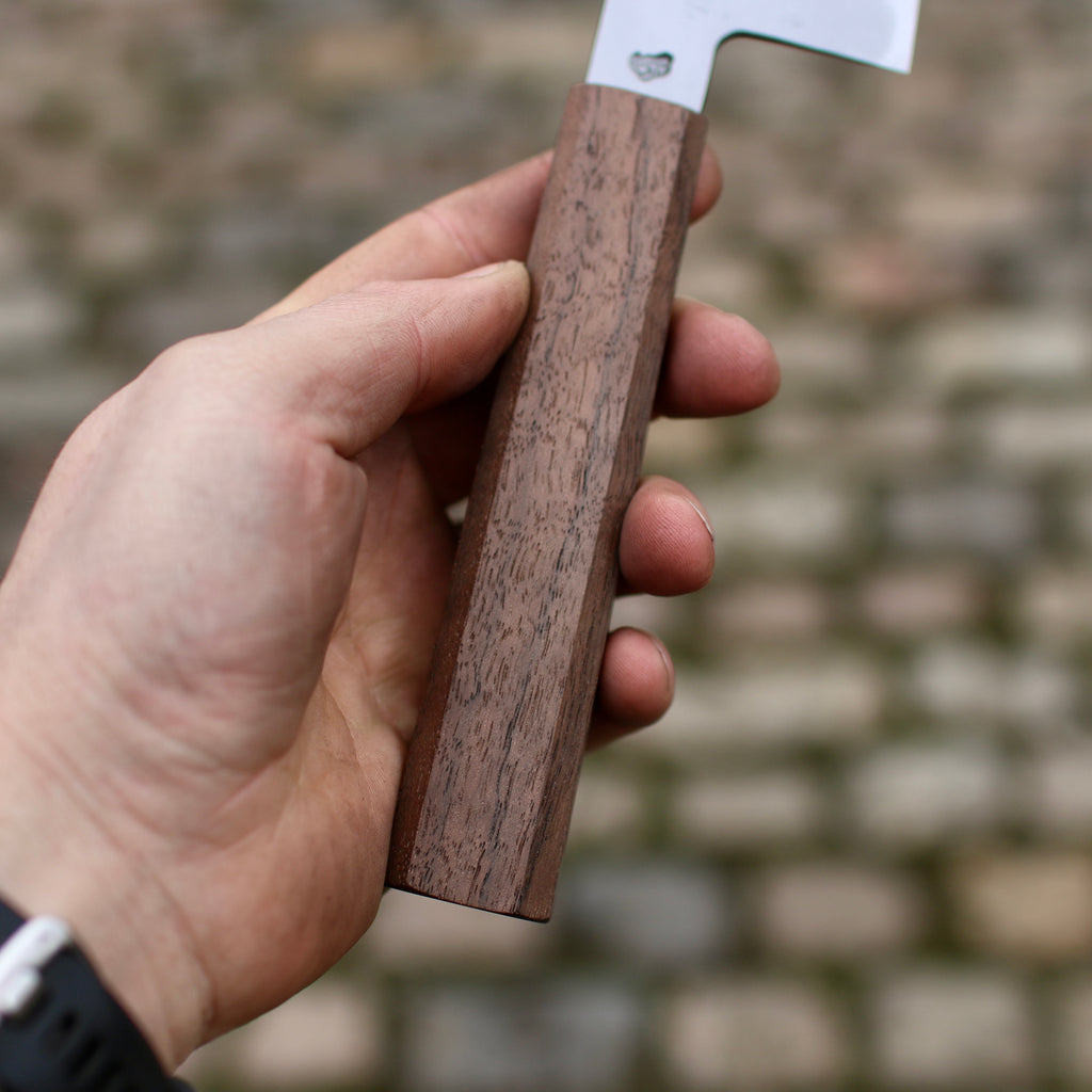 When stated, my knives bevels are ground and polished with Japanese whetstones. This allow an easy maintenance at home. For Sharpening service please contact Scott from www.sheffieldknifesharpening.com