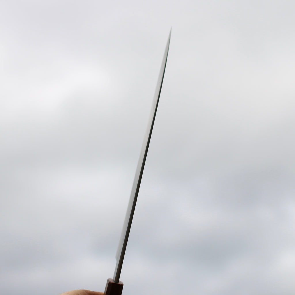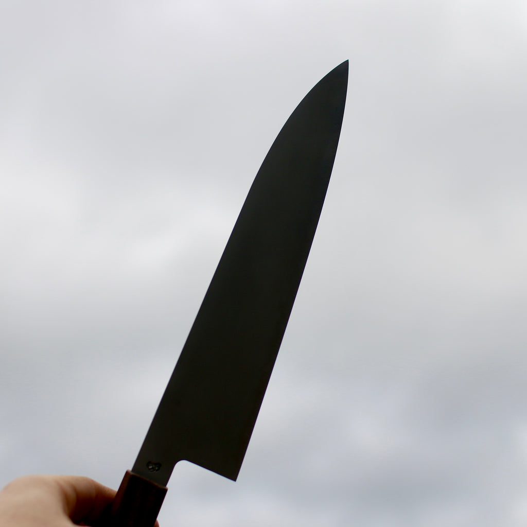 This fully ground Gyuto feature a long blade, good distal taper, and thin geometry. Flat profile with a slight curve toward the tip. The san-mai is made from 26C3 core steel with soft steel cladding. Forged to shape and to geometry the blade is ground on water cooled grinding stone then polished on a rotary platten with a satin finish. Great performer with improved food release.