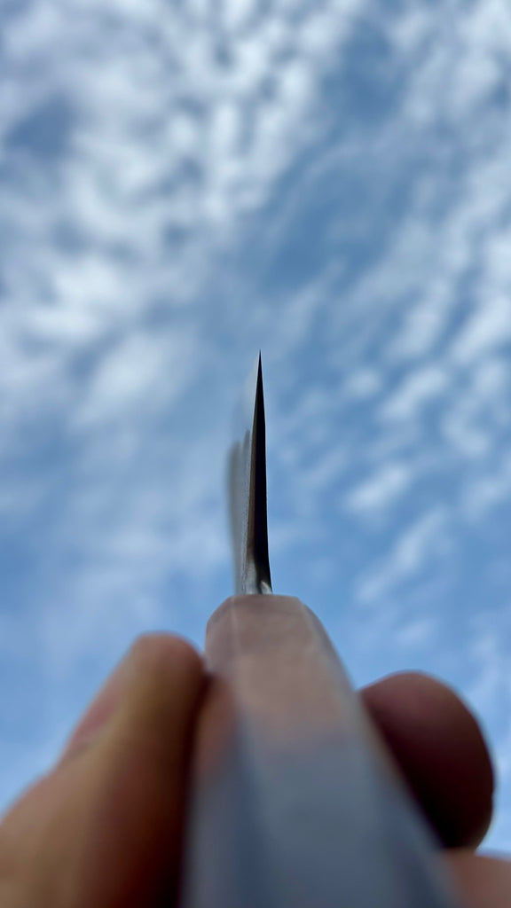 This Nishiji Gyuto feature a long blade, good distal taper, thin tip. Flat profile at the heel with a slight curve toward the tip. The San-mai is made from 135Cr3 steel core with soft steel cladding. Forged to shape and to geometry the blade is ground on water cooled grinding wheel.