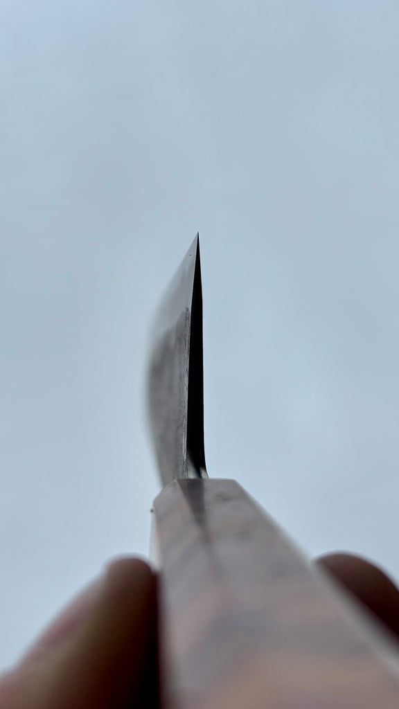 This Nishiji KU Gyuto feature a long blade, good distal taper, and thin tip. Flat profile at the heel with a slight curve toward the tip. The San-mai is made from 115CrV3 steel core with soft steel cladding. Forged to shape and to geometry the blade is ground on water cooled grinding wheel.