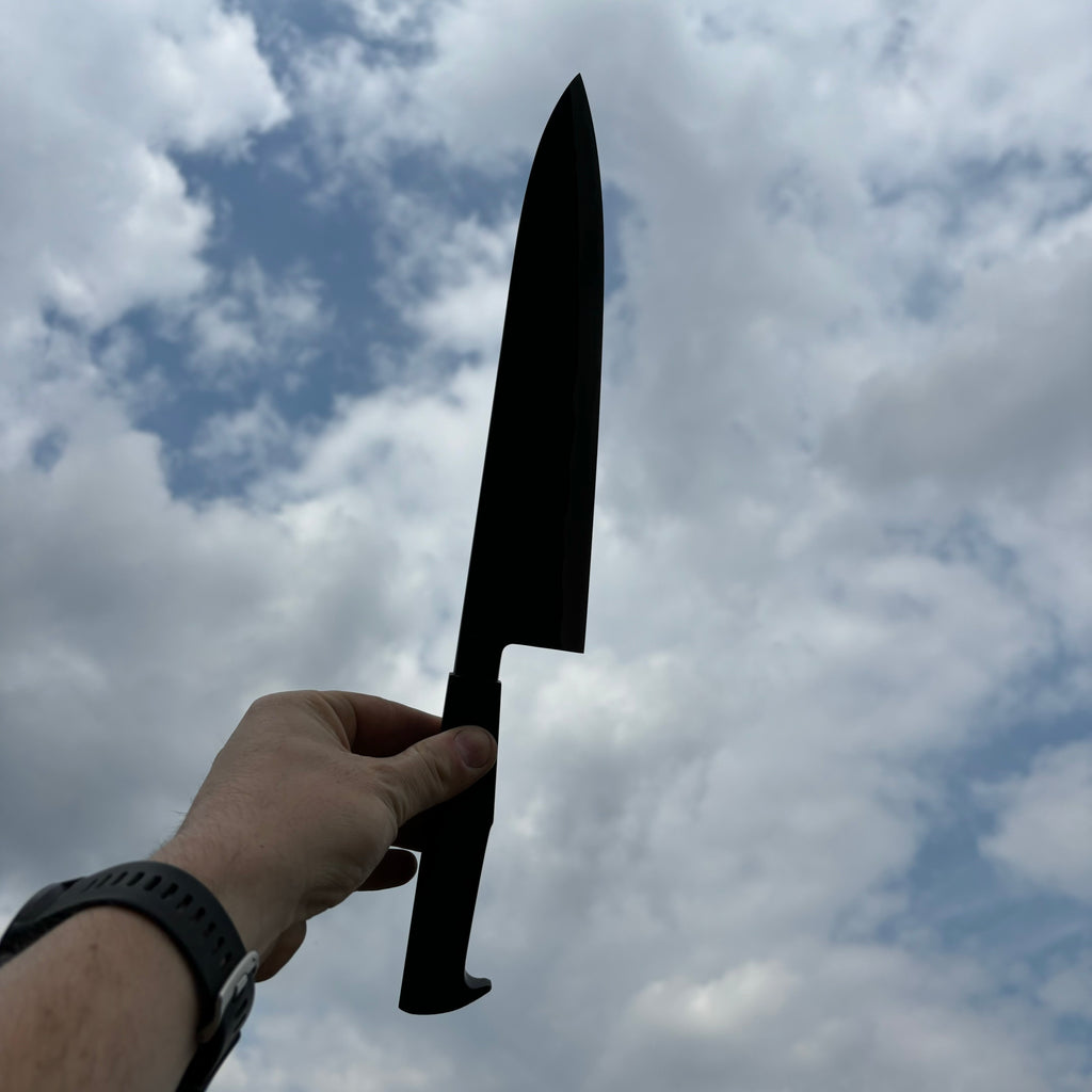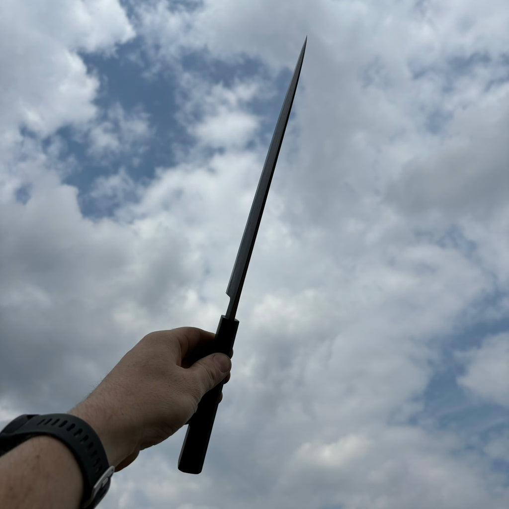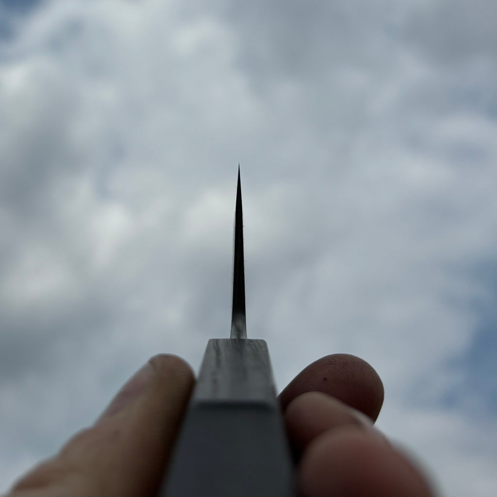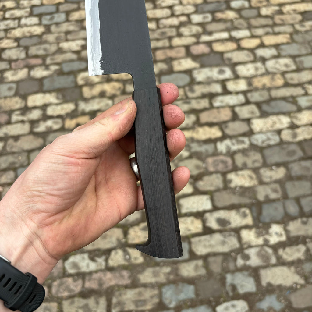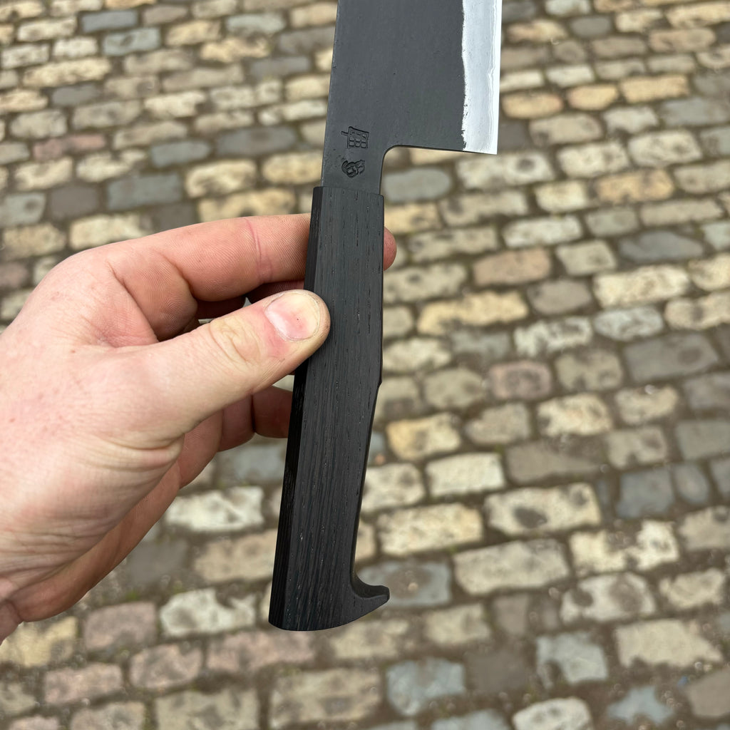 This Gyuto feature a long blade, good distal taper, and thin tip. Flat profile with a slight curve toward the tip. The san-mai is made from 115CrV3 steel core with wrought iron cladding. Forged to shape and to geometry the blade is ground on water cooled grinding wheel with a kasumi finish.