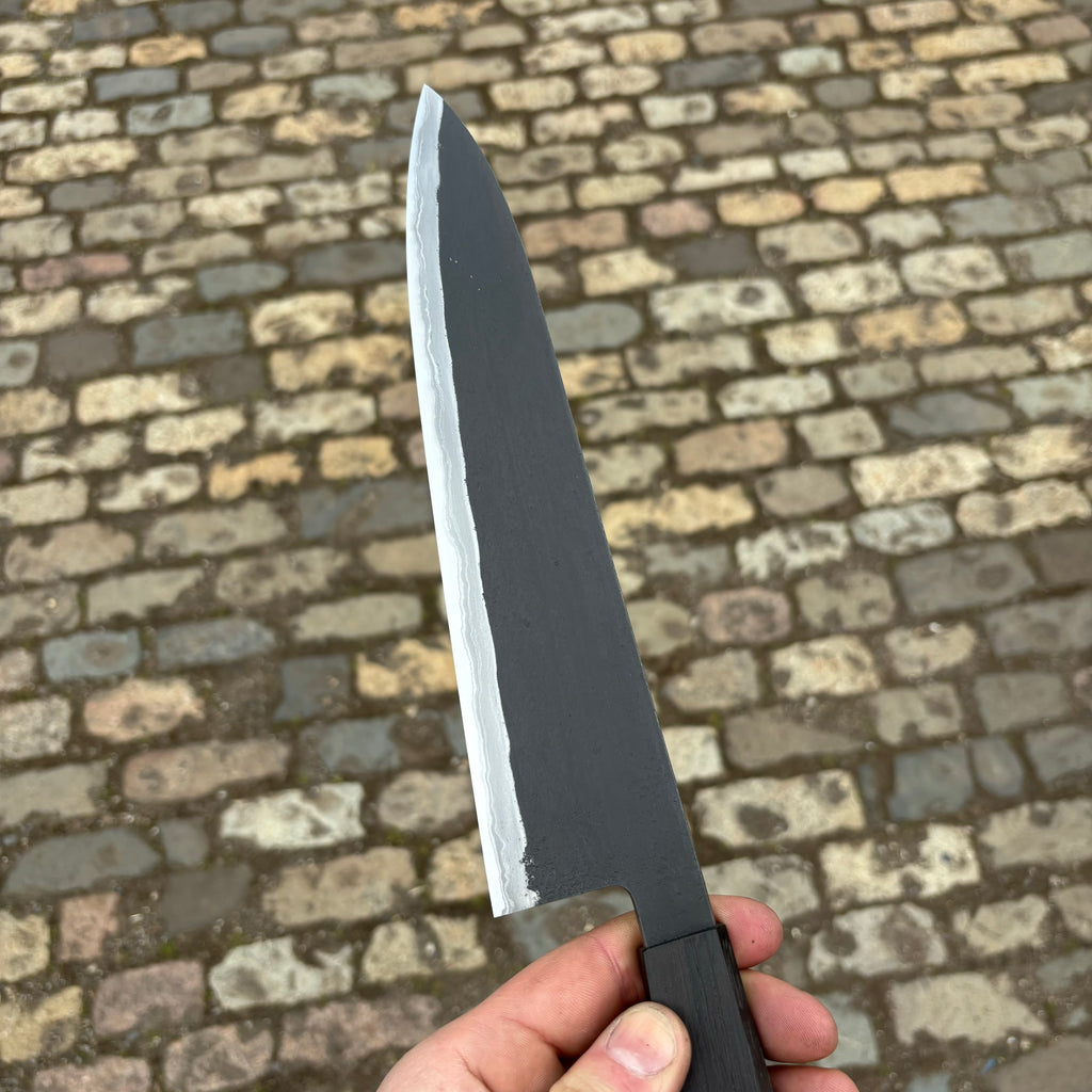 When stated, my knives bevels are ground and polished with Japanese whetstones. This allow an easy maintenance at home. For Sharpening service please contact Scott from www.sheffieldknifesharpening.com