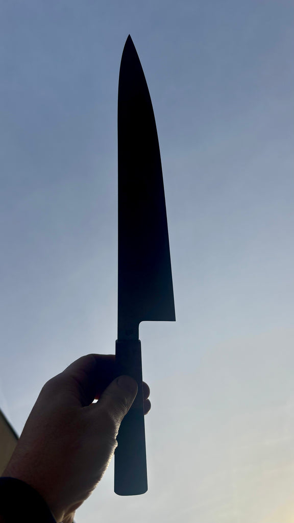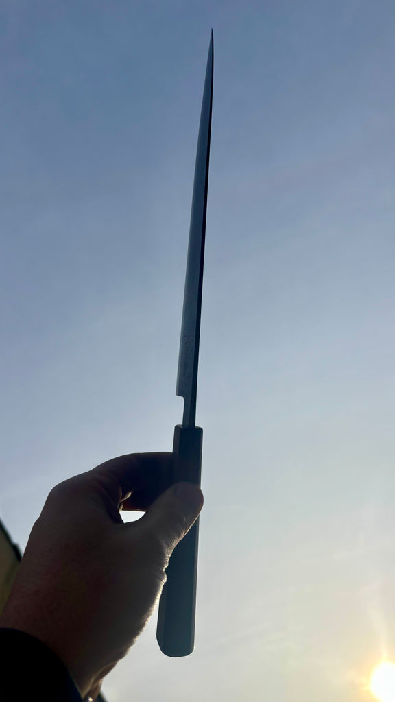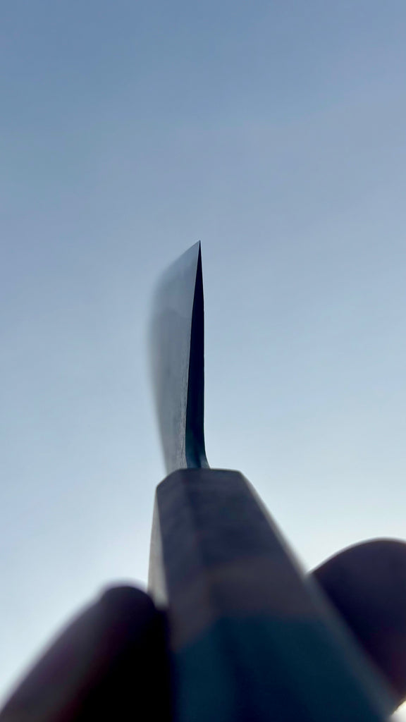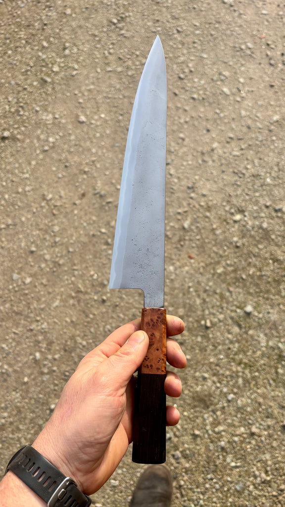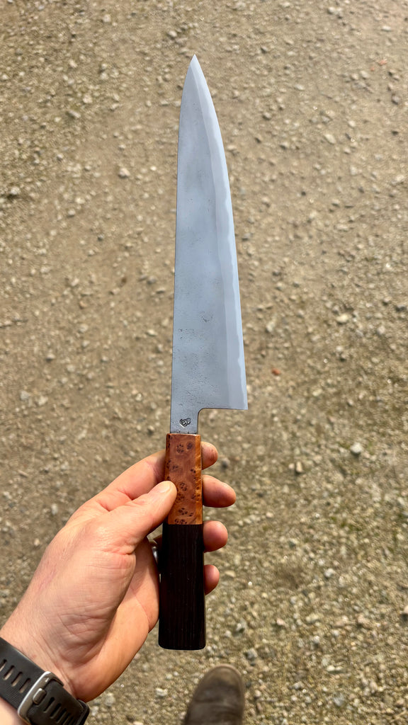 This Nishiji Gyuto feature a long blade, good distal taper, and thin tip. Flat profile at the heel with a slight curve toward the tip. The San-mai is made from 115CrV3 steel core with soft steel cladding. Forged to shape and to geometry the blade is ground on water cooled grinding wheel.