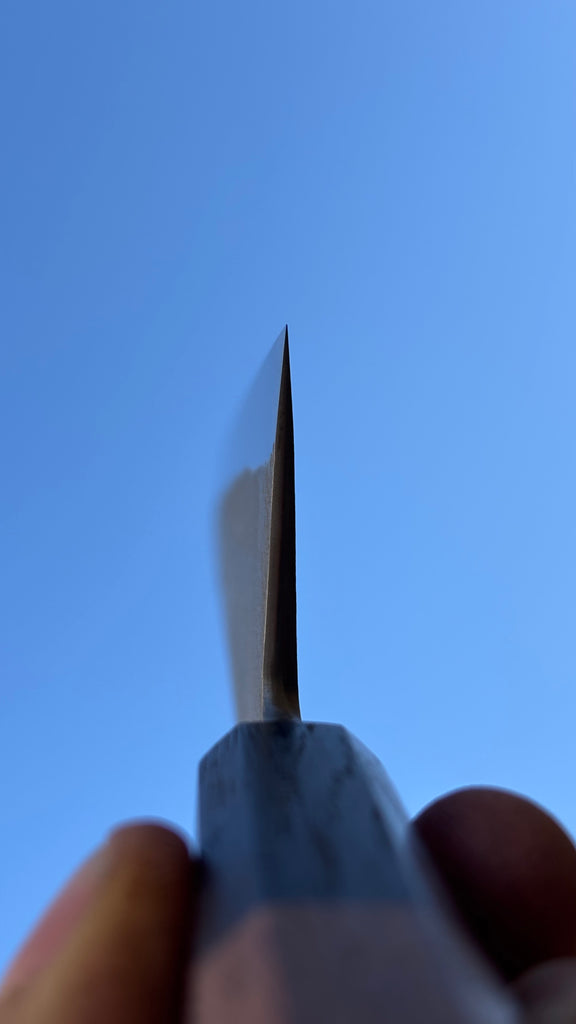 This Tetsu Gyuto feature a long size blade, good distal taper, and thin tip. Flat profile at the heel with a slight curve toward the tip. The San-mai is made from 26C3 steel core with wrought iron cladding. Forged to shape and to geometry the blade is ground on water cooled grinding wheel.