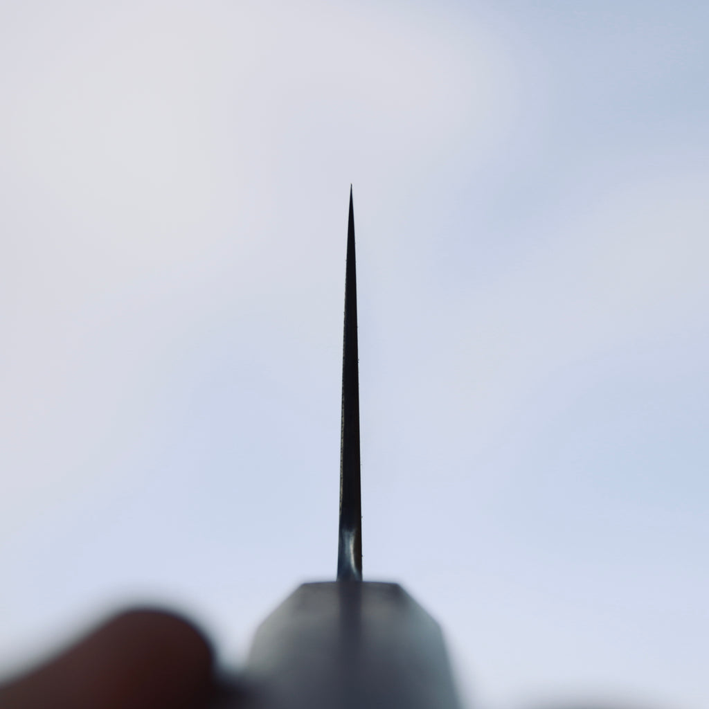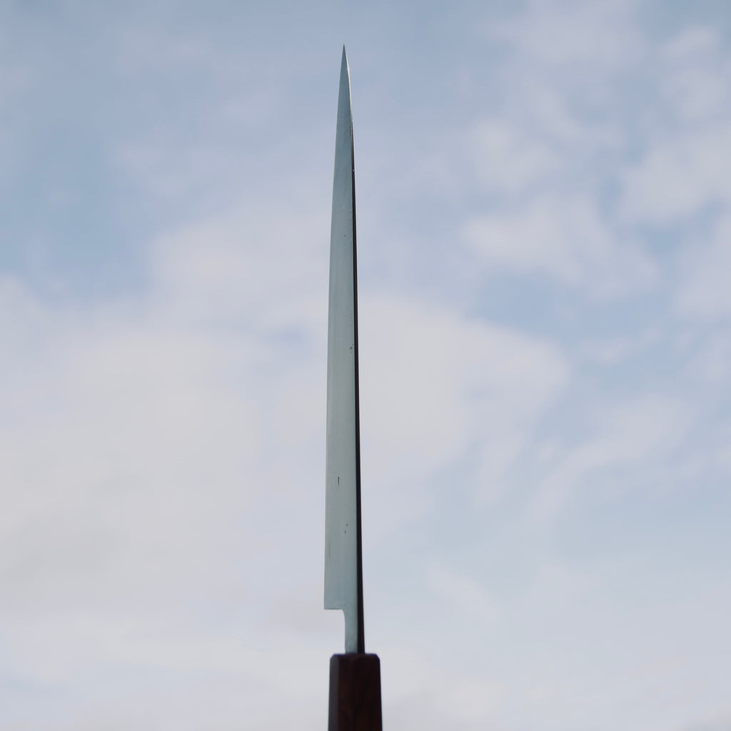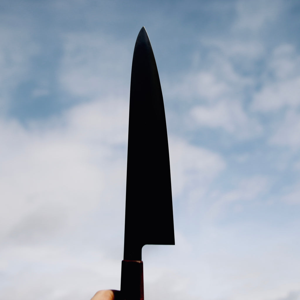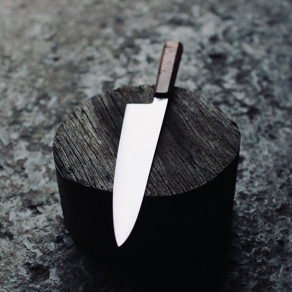 My blades are made from carbon steel not stainless steel, it gives my knives an unbeatable sharpness. I prefer carbon steel for it ease to sharpen, the fine edge it takes and the beautiful patina that will develop. You do, however, need to give carbon steel knives just a little extra care to keep them in top shape. There are trade-offs in everything.