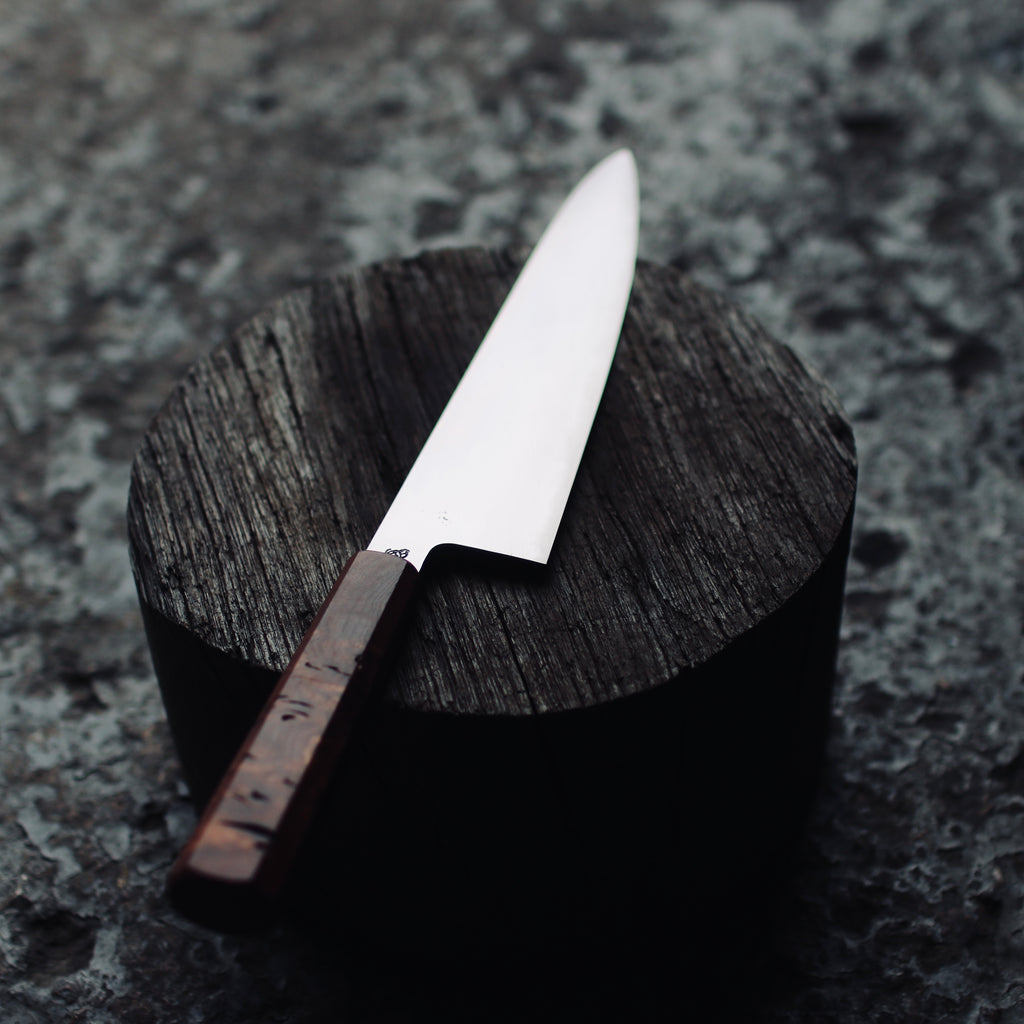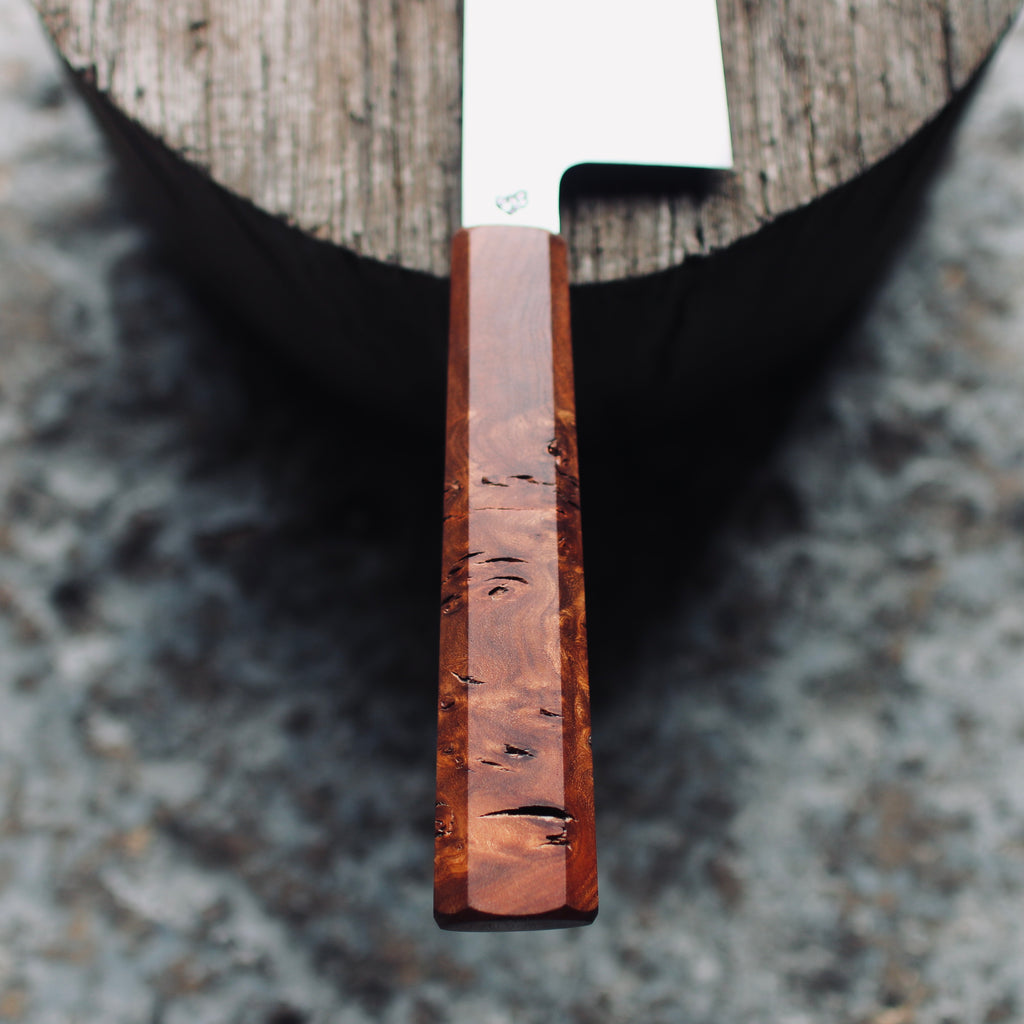 This Gyuto (Japanese chef knife) feature a long, fully ground blade and nimble tip. It give to this blade a good cutting performance and a lot of precision. The handle is made from Burl Elm.