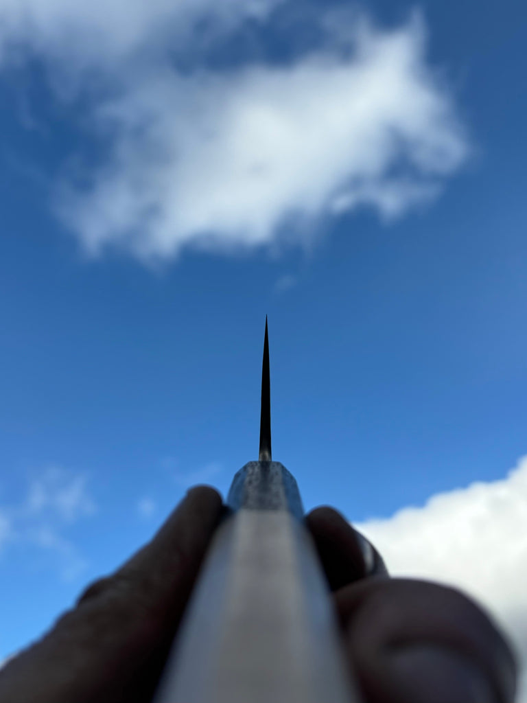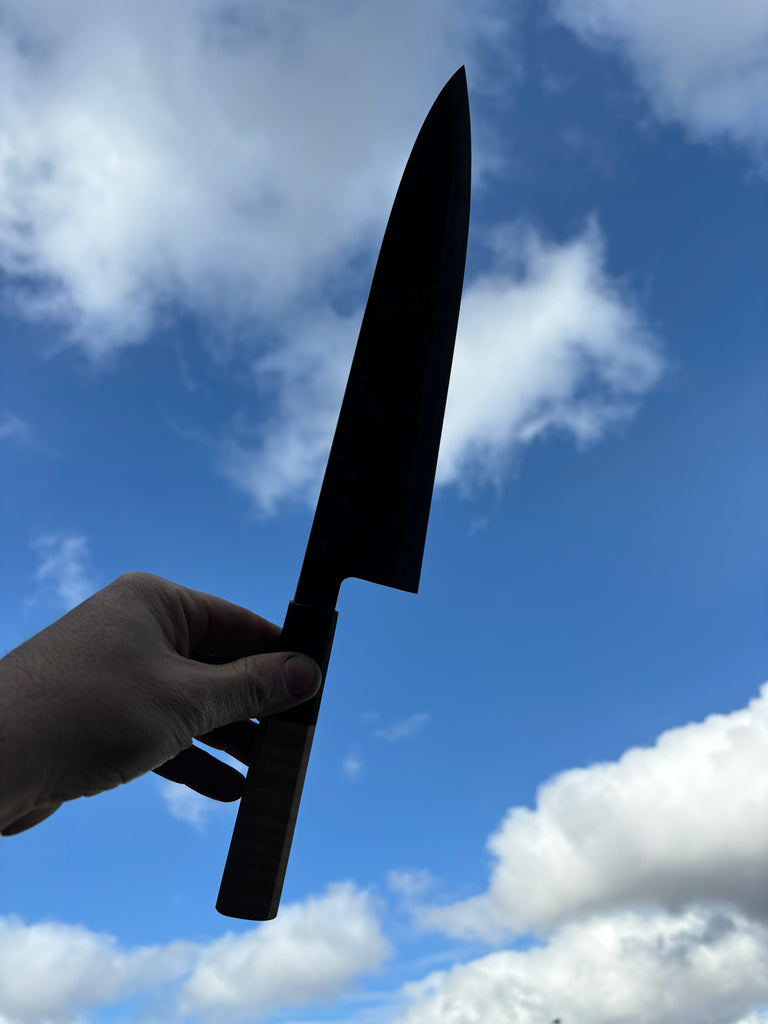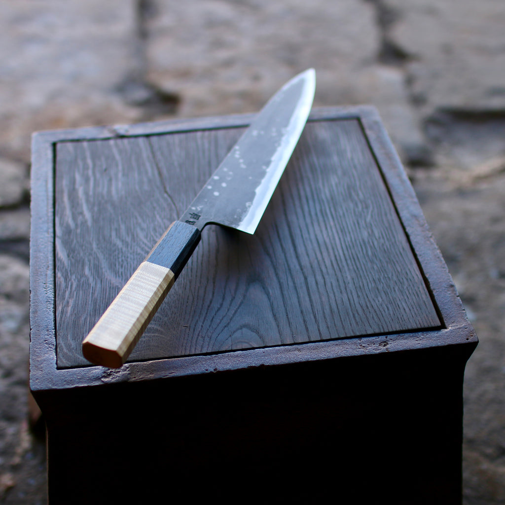 This Gyuto feature long blade, good distal taper, and thin tip. Flat profile with a slight curve toward the tip. The san-mai is made from Shirogami 1 steel core with clean iron cladding. Forged to shape and to geometry the blade is ground on water cooled grinding wheel with a stone finish.