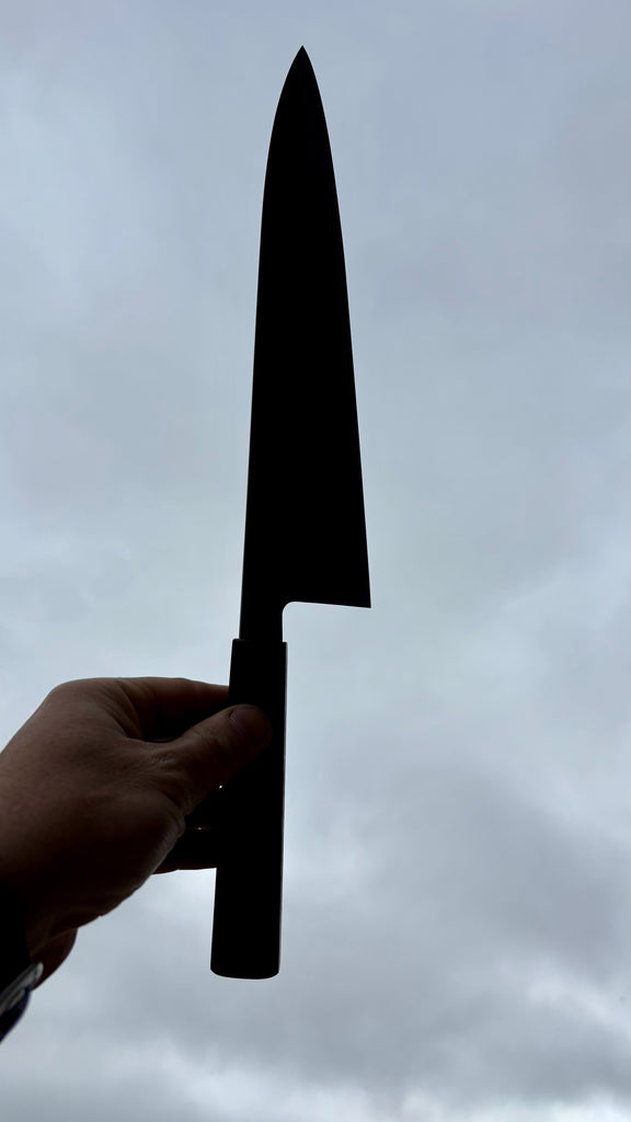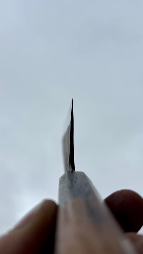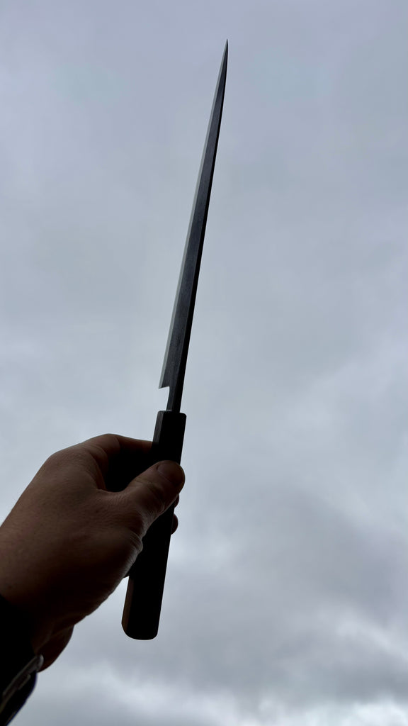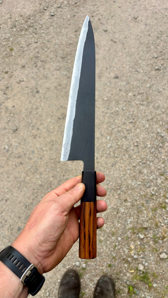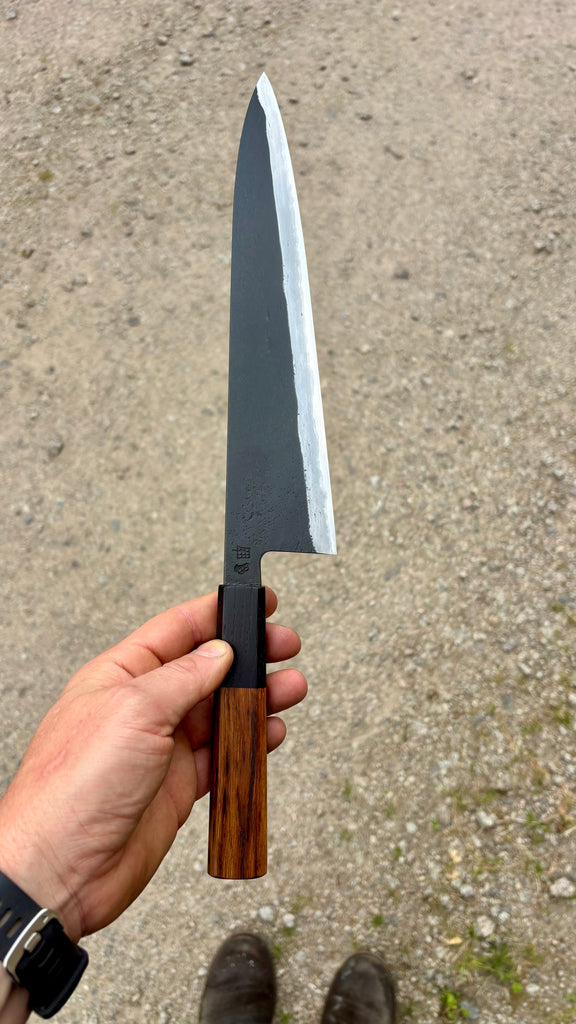 This Tetsu Gyuto feature a long blade, good distal taper, thin tip. Flat profile at the heel with a slight curve toward the tip. The San-mai is made from 135Cr3 steel core with wrought iron cladding. Forged to shape and to geometry the blade is ground on water cooled grinding wheel.